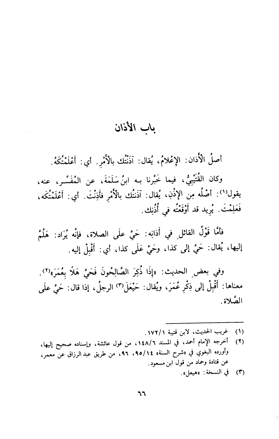فأمَّا قولُ القائلِ في أذانِه: حيَّ على الصلاة، فإنَّه يُراد: هَلُمَّ إليها، يقال: حيَّ إلى كذا، وحيَّ على كذا، أي: أَقْبِلْ إليه.