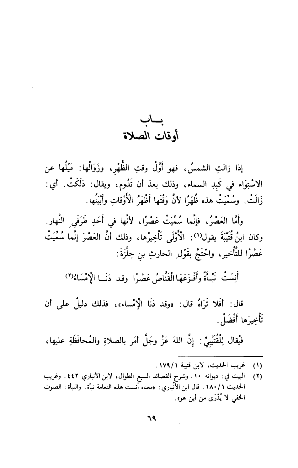 وكان ابنُ قُتَيْبَةَ يقول: الْأَوْلَى تَأخيرُها، وذلك أنَّ العَصْرَ إنَّما سُمِّيَتْ عَصْرًا للتَّأخير، واحْتَجَّ بِقَوْلِ الحارثِ بنِ حِلِزَّةَ: