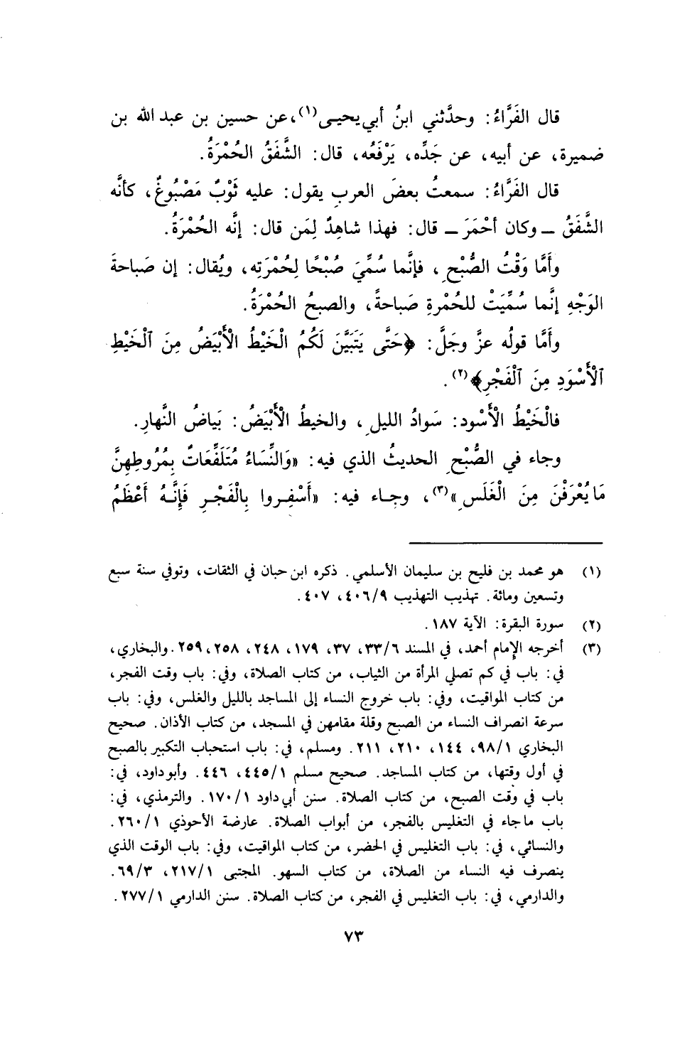 قال الفَرَّاءُ: وحدَّثني ابنُ أبي يحيى، عن حسين بن عبد الله بن ضميرة، عن أبيه، عن جَدِّه، يَرْفَعُه، قال: الشَّفقُ الحُمْرَةُ.