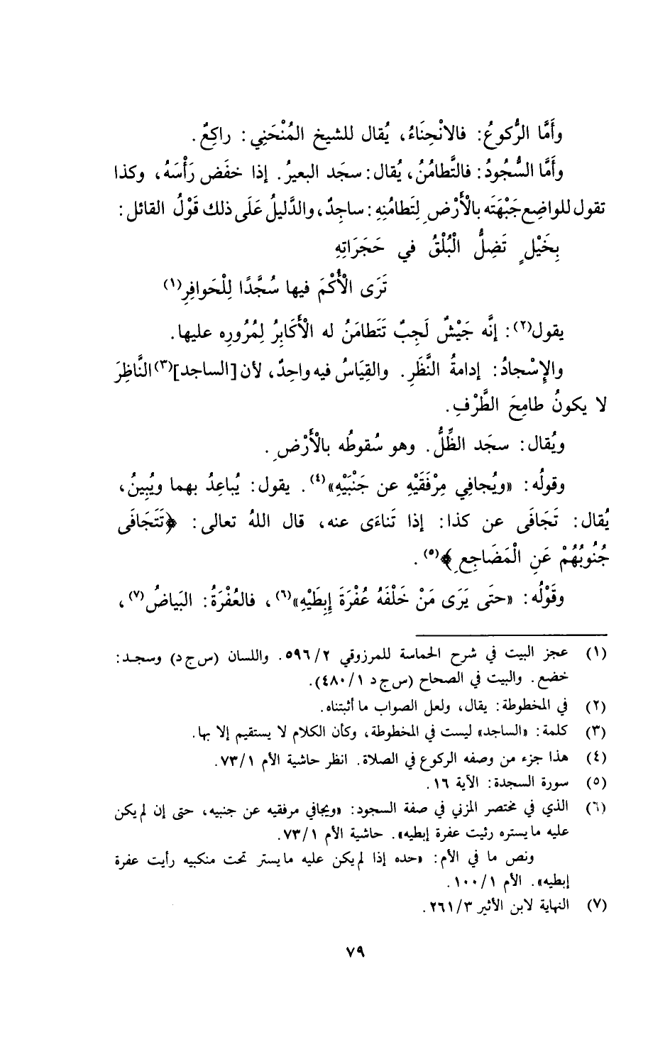 وأمَّا السُّجودُ: فالتَّطامُنُ، يُقال: سَجَدَ البعيرُ. إذا خَفَضَ رأسَهُ، وكذا تقول للواضِع جَبْهَتَه بالأرضِ لِتَطامُنِهِ: ساجِدٌ، والدَّليلُ على ذلك قولُ القائل:
