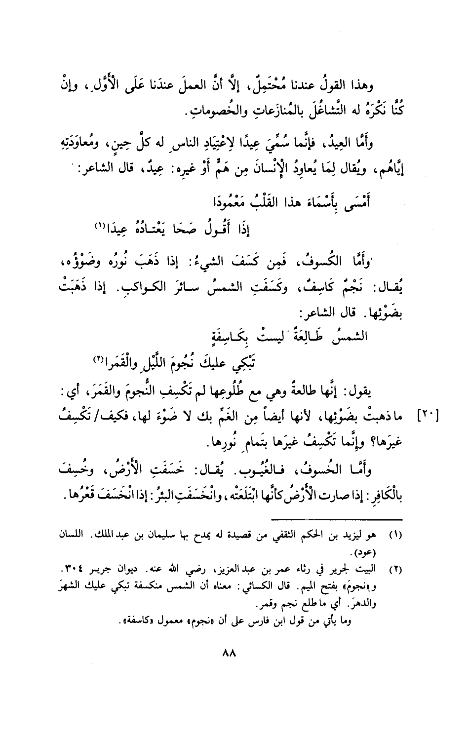 وأمَّا العيدُ، فإنَّما سُمِّيَ عِيدًا لاِعْتِيادِ الناسِ له كلَّ حِينٍ، ومُعاوَدَتِهِ إيَّاهُم، ويُقال لِما يُعاوِدُ الْإنسانَ مِنْ هَمٍّ أوْ غيرِه: عِيدٌ، قال الشاعر: