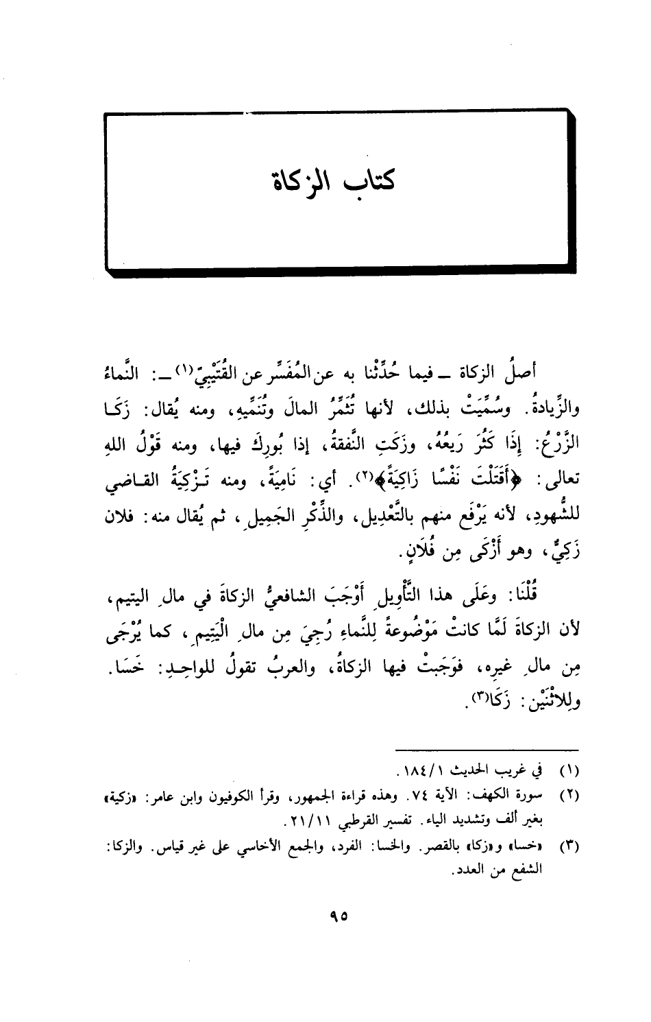 قُلْنا: وعلى هذا التَّاويلِ أوْجَبَ الشافعيُّ الزكاةَ في مالِ اليتيم، لأن الزكاةَ لمَّا كانتْ مَوْضوعَةً للنَّماءِ رُجِيَ مِن مالِ الْيَتِيمِ، كما يُرْجَى مِن مالِ غيرِه، فوَجَبَتْ فيها الزكاةُ، والعربُ تقولُ للواحِدِ: خَسَا. ولِلاثْنَيْن: زَكا.