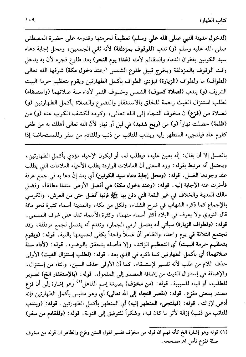 بالغسل إلا أن يقال إنه يعين عليه فيطلب له أو ليكون الإحياء مؤدي بأكمل الطهارتين ويحتمل أنه مرتبط بقوله وردوا لمعنى أن العلامات الواردة بطلب الأحياء هي العلامات التي يطلب عند وجودها الغسل قوله: "ومحل إجابة دعاء سيد الكونين" أي بعد إن دعا به في جمع عرفة فأخرت عنه الإجابة إليه قوله: "وعند دخول مكة" هي أفضل الأرض عندنا مطلقا وفضل مالك المدينة والخلاف في غير البقعة التي دفن بها صلى الله عليه وسلم فإنها أفضل حتى من العرش والكرسي بالإجماع كما ذكره الشهاب في شرح الشفاء ولكل من مكة والمدينة أسماء كثيرة نحو مائة قال النووي ولا يعرف في البلاد أكثر أسماء منهما وكثرة الأسماء تدل على شرف المسمى قوله: "ولطواف الزيارة" سيأتي أنه يغتسل لرمي الجمار وتقدم أنه يغتسل لجمع مزدلفة وقد تجتمع الثلاثة في يوم واحد والظاهر أن غسلا واحدا يكفي لجميعها بالنية قوله: "ويقوم بتعظيم حرمة البيت" أي التعظيم الزائد وإلا فأصله يتحقق بالوضوء قوله: "لأداء سنة صلاتهما" أي بأكمل الطهارتين كما ذكره في الذي بعد قوله: "لطلب إستنزال الغيث" الأولى حذف اللام من طلب لأنه تفسير لإستسقاء كما أن الأولى حذف السين والتاء من إستنزال والإضافة في إستنزال الغيث من إضافة المصدر إلى المفعول قوله: "بالإستغفار الخ" تصوير للطلب أو الباء للسببية قوله: "من مخوف" بصيغة إسم الفاعل1 وهو إشارة إلى أن فزع مصدر بمعنى مفزع قوله: "التجاء إلى الله تعالى" أي وهو متلبس بأكمل الطهارتين فإنه أدعى لإزالته قوله: "فيلتجىء المتطهر إليه" أي المتطهر بأكمل الطهارتين قوله: "ويندب للتائب من ذنب" إزالة لأثر ما كان فيه وشكرا للتوفيق إلى التوبة قوله: "وللقادم من سفر"