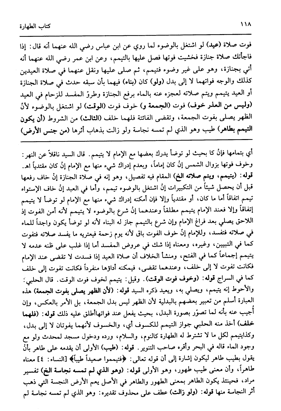 أي بتمامها فإن كان بحيث لو توضأ يدرك بعضها مع الإمام لا يتيمم قال السيد ناقلا عن النهر وخوف فوتها بزوال الشمس إن كان إماما وبعدم إدراك شيء منها مع الإمام إن كان مقتديا اهـ قوله: "يتيمم ويتم صلاته الخ" المقام فيه تفصيل وهو إنه في صلاة الجنازة إن خاف رفعها قبل أن يحصل شيئا من التكبيرات إن اشتغل بالوضوء تيمم وأما في العبد إن خاف الإستواء تيمم اتفاقا أما ما كان أو مقتديا وإلا فإن أمكنه إدراك شيء منها مع الإمام لو توضأ لا يتيمم إتفاقا وإلا فعند الإمام يتيمم مطلقا وعندهما إن شرع بالوضوء لا يتيمم لأنه أمن الفوت إذ اللاحق يصلي بعد فراغ الإمام وإن شرع بالتيمم جاز له البناء لأنه لو توضأ يكون واجدا للماء في صلاته فتفسد وللإمام إن خوف الفوت باق لأنه يوم زحمة فيعتريه ما يفسد صلاته فتفوت كما في التبيين وغيره ومعناه إذا شك في عروض المفسد أما إذا غلب على ظنه عدمه لا يتيمم إجماعا كما في الفتح ومنشأ الخلاف أن صلاة العيد إذا فسدت لا تقضى عند الإمام فكانت تفوت لا إلى خلف وعندهما تقضى فيمكنه أداؤها منفردا فكانت تفوت إلى خلف كما في السراج قوله: "وخوف فوت الوقت" وقيل يتيمم لخوف فوت الوقت قال الحلبي والأحوط إنه يتيمم ويصلي به ويعيد ذكره السيد قوله: "لأن الظهر يصلي بفوت الجمعة" هذه العبارة أسلم من تعبير بعضهم بالبدلية لأن الظهر ليس بدل الجمعة بل الأمر بالعكس وإن أجيب عنه بأنه لما تصور بصورة البدل بحيث يفعل عند فواتهاأطلق عليه ذلك قوله: "فلهما خلف" أخذ منه الحلبي جواز التيمم للكسوف أي والخسوف لأنهما يفوتان لا إلى بدل وكذايتيمم لكل ما لا تشترط له الطهارة كالنوم والسلام ورده ودخول مسجد لمحدث ولو مع وجود الماء قاله في البحر وأقره صاحب التنوير قوله: "طيب" الأولى أن يقدمه على طاهر بأن يقول بطيب طاهر ليكون إشارة إلى أن قوله تعالى: {فَتَيَمَّمُوا صَعِيداً} [النساء: 43] معناه طاهرا وأن معنى طيب طهور وهو الأولى قوله: "وهو الذي لم تمسه نجاسة الخ" تفسير مراد فحينئذ يكون الطاهر بمعنى الطهور والطاهر في الأصل يعم الأرض النجسة التي ذهب أثر النجاسة منها قوله: "ولو زالت" عطف على محذوف تقديره وهو الذي لم تمسه نجاسة لم.