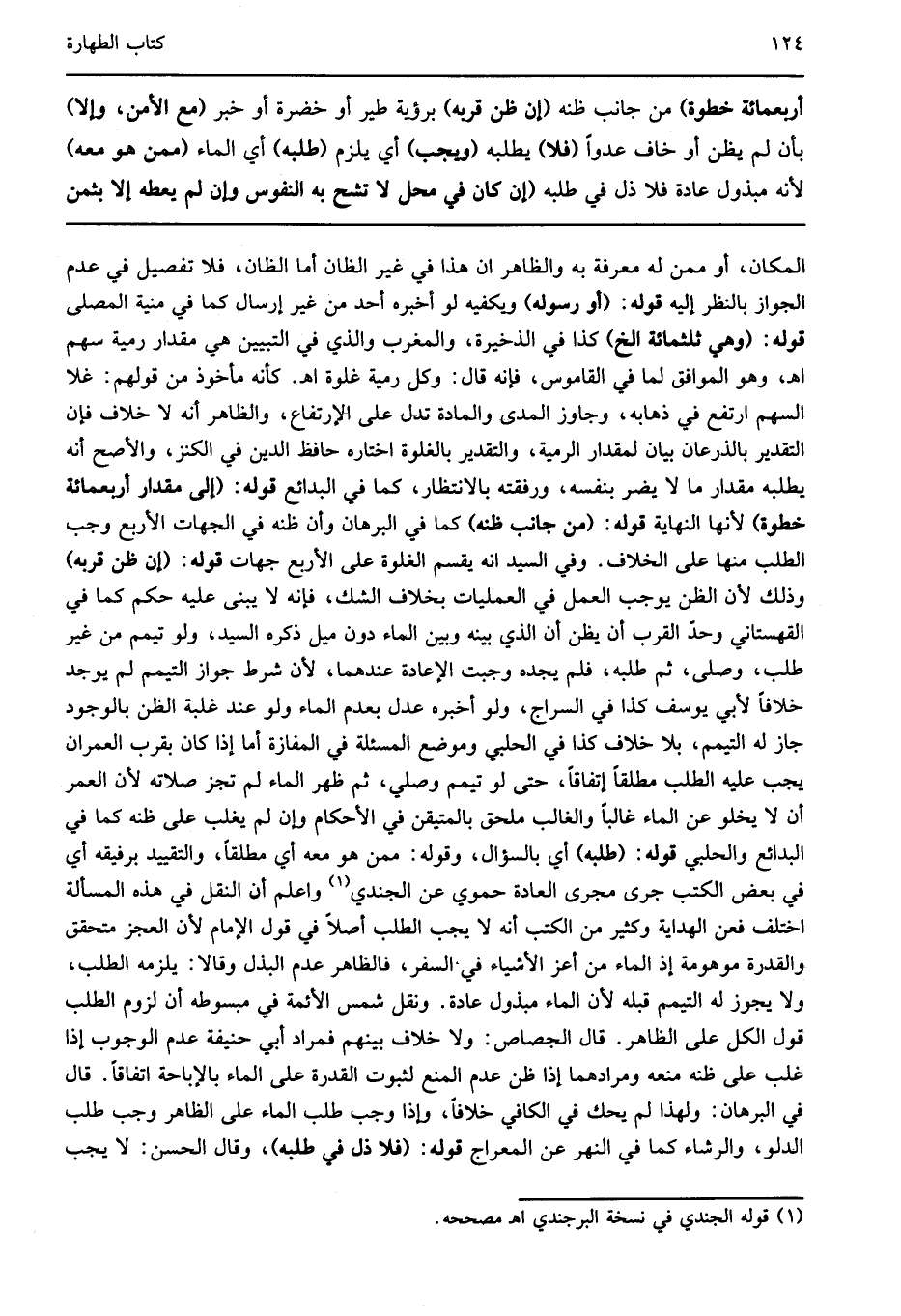 المكان أو ممن له معرفة به والظاهر ان هذا في غير الظان أما الظان فلا تفصيل في عدم الجواز بالنظر إليه قوله: "أو رسوله" ويكفيه لو أخبره أحد من غير إرسال كما في منية المصلى قوله: "وهي ثلثمائة الخ" كذا في الذخيرة والمغرب والذي في التبيين هي مقدار رمية سهم اهـ وهو الموافق لما في القاموس فإنه قال وكل رمية غلوة اهـ كأنه مأخوذ من قولهم غلا السهم ارتفع في ذهابه وجاوز المدى والمادة تدل على الإرتفاع والظاهر أنه لا خلاف فإن التقدير بالذرعان بيان لمقدار الرمية والتقدير بالغلوة اختاره حافظ الدين في الكنز والأصح أنه يطلبه مقدار ما لا يضر بنفسه ورفقته بالانتظار كما في البدائع قوله: "إلى مقدار أربعمائة خطوة" لأنها النهاية قوله: "من جانب ظنه" كما في البرهان وأن ظنه في الجهات الأربع وجب الطلب منها على الخلاف وفي السيد انه يقسم الغلوة على الأربع جهات قوله: "أن ظن قربه" وذلك لأن الظن يوجب العمل في العمليات بخلاف الشك فإنه لا يبنى عليه حكم كما في القهستاني وحد القرب أن يظن أن الذي بينه وبين الماء دون ميل ذكره السيد ولو تيمم من غير طلب وصلى ثم طلبه فلم يجده وجبت الإعادة عندهما لأن شرط جواز التيمم لم يوجد خلافا لأبي يوسف كذا في السراج ولو أخبره عدل بعدم الماء ولو عند غلبة الظن بالوجود جاز له التيمم بلا خلاف كذا في الحلبي وموضع المسئلة في المفازة أما إذا كان بقرب العمران يجب عليه الطلب مطلقا إتفاقا حتى لو تيمم وصلي ثم ظهر الماء لم تجز صلاته لأن العمر إن لا يخلو عن الماء غالبا والغالب ملحق بالمتيقن في الأحكام وإن لم يغلب على ظنه كما في البدائع والحلبي قوله: "طلبه" أي بالسؤال وقوله ممن هو معه أي مطلقا والتقييد برفيقه أي في بعض الكتب جرى مجرى العادة حموي عن الجندي1 واعلم أن النقل في هذه المسألة اختلف فعن الهداية وكثير من الكتب أنه لا يجب الطلب أصلا في قول الإمام لأن العجز متحقق والقدرة موهومة إذ الماء من أعز الأشياء في السفر فالظاهر عدم البذل وقالا يلزمه الطلب ولا يجوز له التيمم قبله لأن الماء مبذول عادة ونقل شمس الأئمة في مبسوطه أن لزوم الطلب قول الكل على الظاهر قال الجصاص ولا خلاف بينهم فمراد أبي حنيفة عدم الوجوب إذا غلب على ظنه منعه ومرادهما إذا ظن عدم المنع لثبوت القدرة على الماء بالإباحة اتفاقا قال في البرهان ولهذا لم يحك في الكافي خلافا وإذا وجب طلب الماء على الظاهر وجب طلب الدلو والرشاء كما في النهر عن المعراج قوله: "فلا ذل في طلبه" وقال الحسن لا يجب.