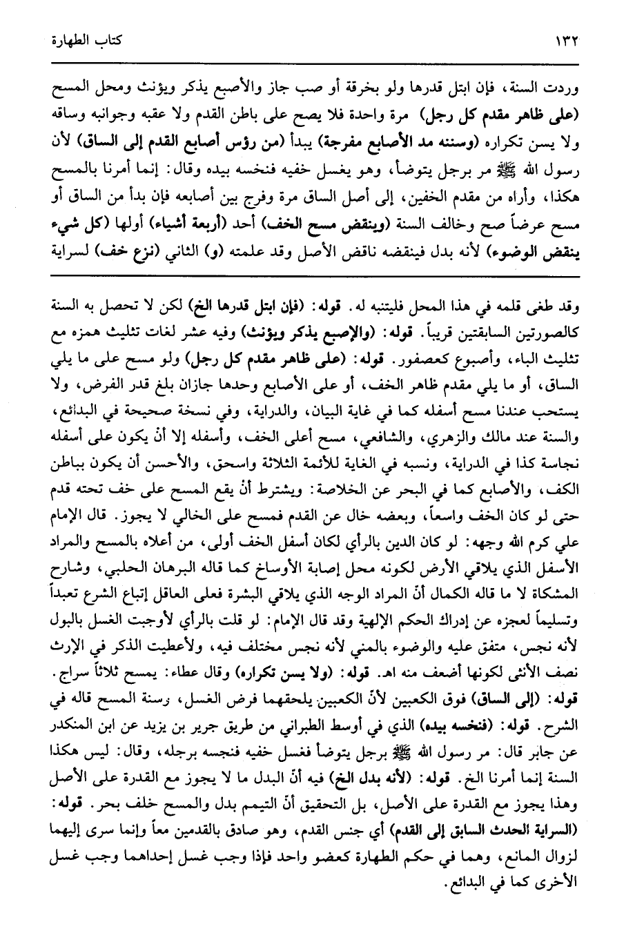 وقد طغى قلمه في هذا المحل فليتنبه له قوله: "فإن ابتل قدرها الخ" لكن لا تحصل به السنة كالصورتين السابقتين قريبا قوله: "والإصبع يذكر ويؤنث" وفيه عشر لغات تثليث همزه مع تثليث الباء وأصبوع كعصفور قوله: "على ظاهر مقدم كل رجل" ولو مسح على ما يلي الساق أو ما يلي مقدم ظاهر الخف أو على الأصابع وحدها جازان بلغ قدر الفرض ولا يستحب عندنا مسح أسفله كما في غاية البيان والدراية وفي نسخة صحيحة في البدائع والسنة عند مالك والزهري والشافعي مسح أعلى الخف وأسفله إلا أن يكون على أسفله نجاسة كذا في الدراية ونسبه في الغاية للأئمة الثلاثة واسحق والأحسن أن يكون بباطن الكف والأصابع كما في البحر عن الخلاصة ويشترط أن يقع المسح على خف تحته قدم حتى لو كان الخف واسعا وبعضه خال عن القدم فمسح على الخالي لا يجوز قال الإمام علي كرم الله وجهه لو كان الدين بالرأي لكان أسفل الخف أولى من أعلاه بالمسح والمراد الأسفل الذي يلاقي الأرض لكونه محل إصابة الأوساخ كما قاله البرهان الحلبي وشارح المشكاة لا ما قاله الكمال أن المراد الوجه الذي يلاقي البشرة فعلى العاقل إتباع الشرع تعبدا وتسليما لعجزه عن إدراك الحكم الإلهية وقد قال الإمام لو قلت بالرأي لأوجبت الغسل بالبول لأنه نجس متفق عليه والوضوء بالمني لأنه نجس مختلف فيه ولأعطيت الذكر في الإرث نصف الأنثى لكونها أضعف منه اهـ قوله: "ولا يسن تكراره" وقال عطاء يمسح ثلاثا سراج قوله: "إلى الساق" فوق الكعبين لأن الكعبين يلحقهما فرض الغسل وسنة المسح قاله في الشرح قوله: "فنخسه بيده" الذي في أوسط الطبراني من طريق جرير بن يزيد عن ابن المنكدر عن جابر قال مر رسول الله صلى الله عليه وسلم برجل يتوضأ فغسل خفيه فنخسه برجله وقال ليس هكذا السنة إنما أمرنا الخ قوله: "لأنه بدل الخ" فيه أن البدل ما لا يجوز مع القدرة على الأصل وهذا يجوز مع القدرة على الأصل بل التحقيق أن التيمم بدل والمسح خلف بحر قوله: "لسراية الحدث السابق إلى القدم" أي جنس القدم وهو صادق بالقدمين معا وإنما سرى إليهما لزوال المانع وهما في حكم الطهارة كعضو واحد فإذا وجب غسل إحداهما وجب غسل الأخرى كما في البدائع.