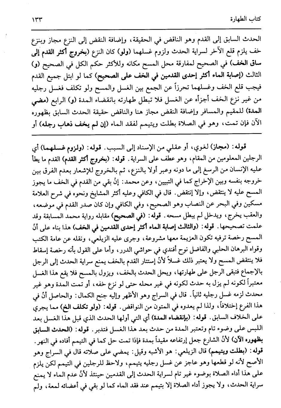 قوله: "مجاز" لغوي أو عقلي من الإسناد إلى السبب قوله: "ولزوم غسلهما" أي الرجلين المعلومين من المقام وهو عطف على السراية قوله: "بخروج أكثر القدم" القدم ما يطأ عليه الإنسان من الرسغ إلى ما دونه وعبر أولا بالنزع ثم بالخروج للإشعار بعدم الفرق بين خروجه بنفسه وبين الإخراج كما في التبيين وعن محمد إن بقي من القدم في الخف ما يجوز المسح عليه لا ينتقض وإلا إنتقض قال في الكافي وعليه أكثر المشايخ ونحوه في شرح العلامة مسكين وفي البحر عن النصاب وهو الصحيح وفي الكافي وإن كان صدر القدم في موضعه والعقب يخرج ويدخل لم يبطل مسحه قوله: "في الصحيح" مقابله رواية محمد المسابقة وقد علمت تصحيحها قوله: "والثالث إصابة الماء أكثر إحدى القدمين في الخف" هذا بناء على أن المسح رخصة ترفيه تكون العزيمة معها مشروعة وجرى عليه الزيلعي ونقله عن عامة الكتب وقواه البرهان الحلبي والفاضل نوح أفندي في حواشي الدرر وأما على القول بأنه رخصة إسقاط فلا ينتقض المسح ولا يعتبر ذلك غسلا لأن إستتار القدم بالخف يمنع سراية الحدث إلى الرجل بالإجماع فتبقى الرجل على طهارتها ويحل الحدث بالخف ويزول بالمسح فلا يقع هذا الغسل معتبرا لكونه لم يزل به حدث لكونه في غير محله حتى لو نزع خفه أو تمت المدة وهو غير محدث لزمه غسل رجليه ثانيا قال في السراج وهو الأظهر وإليه جنح الكمال والحاصل أن في هذا الفرع إختلافا ولذا لم يعدوه في المتون من النواقض قوله: "ولو تكلف الخ" مما يجري على الخلاف السابق قوله: "بإنقضاء المدة" أي التي أولها الحدث الذي قبل هذا الغسل بعد اللبس على وضوء تام وتعتبر المدة من حدث بعد هذا الغسل فتدبر قوله: "الحدث السابق بظهوره الآن" لأن الشارع جعل إرتفاعه مقيدا بمدة فإذا تمت حل كما في التيمم أفاده في النهر قوله: "بطلت ويتيمم" قال الزيلعي هو الأشبه وقيل يمضي على صلاته قال في السراج وهو الأصح لأنه لو قطعها وهو عاجز عن غسل رجليه يتيمم ولاحظ للرجلين في التيمم لكن يلزم على هذا أداء الصلاة بوضوء غير تام لسراية الحدث إلى القدمين حينئذ لأن عدم الماء لا يمنع سراية الحدث ولا يجوز أداء الصلاة إلا بتيمم عند فقد الماء كما لو بقي في أعضائه لمعة ولم.