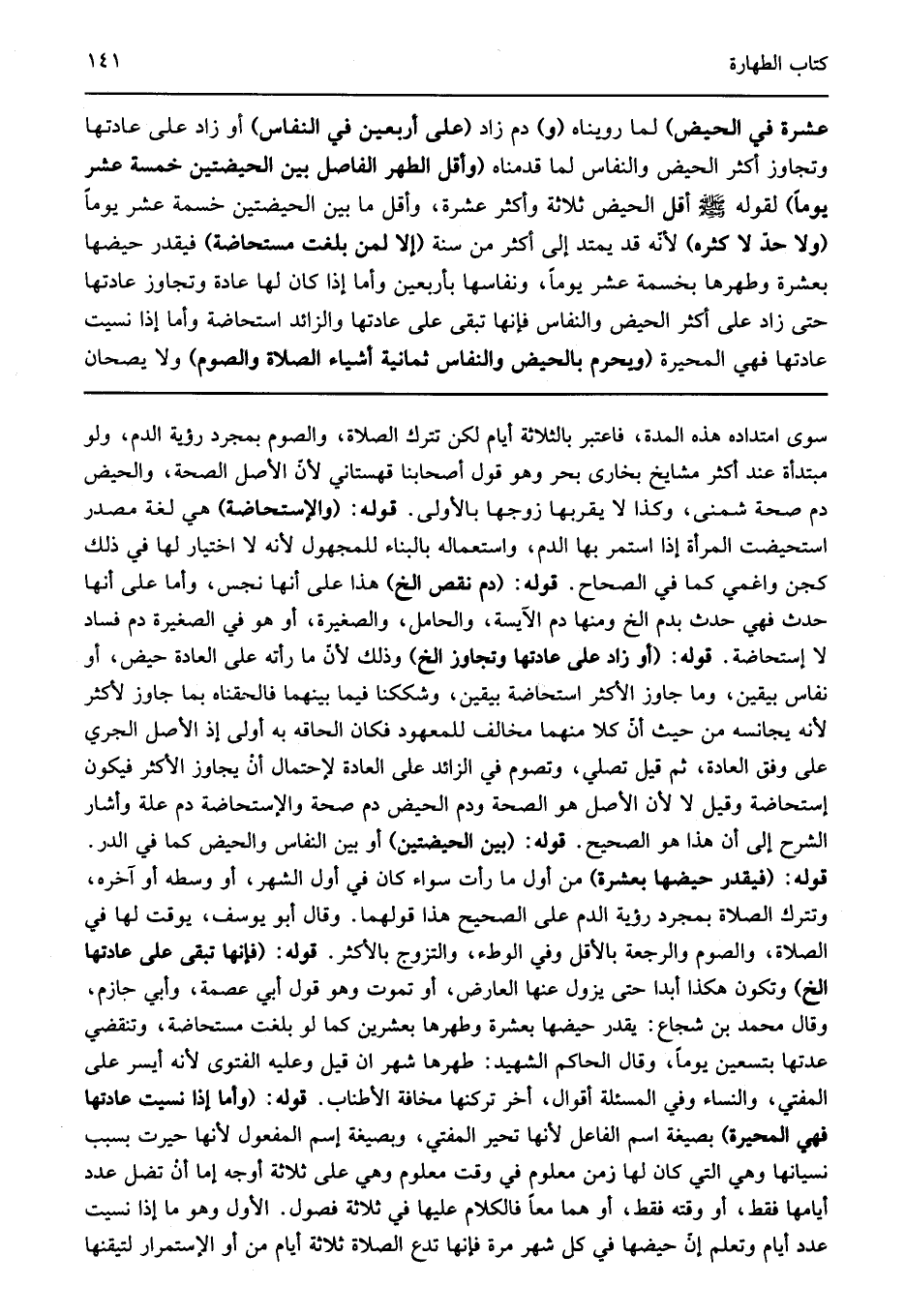 سوى امتداده هذه المدة فاعتبر بالثلاثة أيام لكن تترك الصلاة والصوم بمجرد رؤية الدم ولو مبتدأة عند أكثر مشايخ بخارى بحر وهو قول أصحابنا قهستاني لأن الأصل الصحة والحيض دم صحة شمنى وكذا لا يقربها زوجها بالأولى قوله: "والإستحاضة" هي لغة مصدر استحيضت المرأة إذا استمر بها الدم واستعماله بالبناء للمجهول لأنه لا اختيار لها في ذلك كجن واغمي كما في الصحاح قوله: "دم نقص الخ" هذا على أنها نجس وأما على أنها حدث فهي حدث بدم الخ ومنها دم الآيسة والحامل والصغيرة أو هو في الصغيرة دم فساد لا إستحاضة قوله: "أو زاد على عادتها وتجاوز الخ" وذلك لأن ما رأته على العادة حيض أو نفاس بيقين وما جاوز الأكثر استحاضة بيقين وشككنا فيما بينهما فالحقناه بما جاوز الأكثر لأنه يجانسه من حيث أن كلا منهما مخالف للمعهود فكان الحاقه به أولى إذ الأصل الجري على وفق العادة ثم قيل تصلي وتصوم في الزائد على العادة لإحتمال أن يجاوز الأكثر فيكون استحاضة وقيل لا لأن الأصل هو الصحة ودم الحيض دم صحة والإستحاضة دم علة وأشار الشرح إلى أن هذا هو الصحيح قوله: "بين الحيضتين" أو بين النفاس والحيض كما في الدر قوله: "فيقدر حيضها بعشرة" من أول ما رأت سواء كان في أول الشهر أو وسطه أو آخره وتترك الصلاة بمجرد رؤية الدم على الصحيح هذا قولهما وقال أبو يوسف يوقت لها في الصلاة والصوم والرجعة بالأقل وفي الوطء والتزوج بالأكثر قوله: "فإنها تبقى على عادتها الخ" وتكون هكذا أبدا حتى يزول عنها العارض أو تموت وهو قول أبي عصمة وأبي حازم وقال محمد بن شجاع يقدر حيضها بعشرة وطهرها بعشرين كما لو بلغت مستحاضة وتنقضي عدتها بتسعين يوما وقال الحاكم الشهيد طهرها شهر ان قيل وعليه الفتوى لأنه أيسر على المفتي والنساء وفي المسئلة أقوال أخر تركنها مخافة الأطناب قوله: "وأما إذا نسيت عادتها فهي المحيرة" بصيغة اسم الفاعل لأنها تحير المفتي وبصيغة إسم المفعول لأنها حيرت بسبب نسيانها وهي التي كان لها زمن معلوم في وقت معلوم وهي على ثلاثة أوجه إما أن تضل عدد أيامها فقط أو وقته فقط أو هما معا فالكلام عليها في ثلاثة فصول الأول وهو ما إذا نسيت عدد أيام عادتها وتعلم إن حيضها في كل شهر مرة فإنها تدع الصلاة ثلاثة أيام من أول الإستمرار لتيقنها.