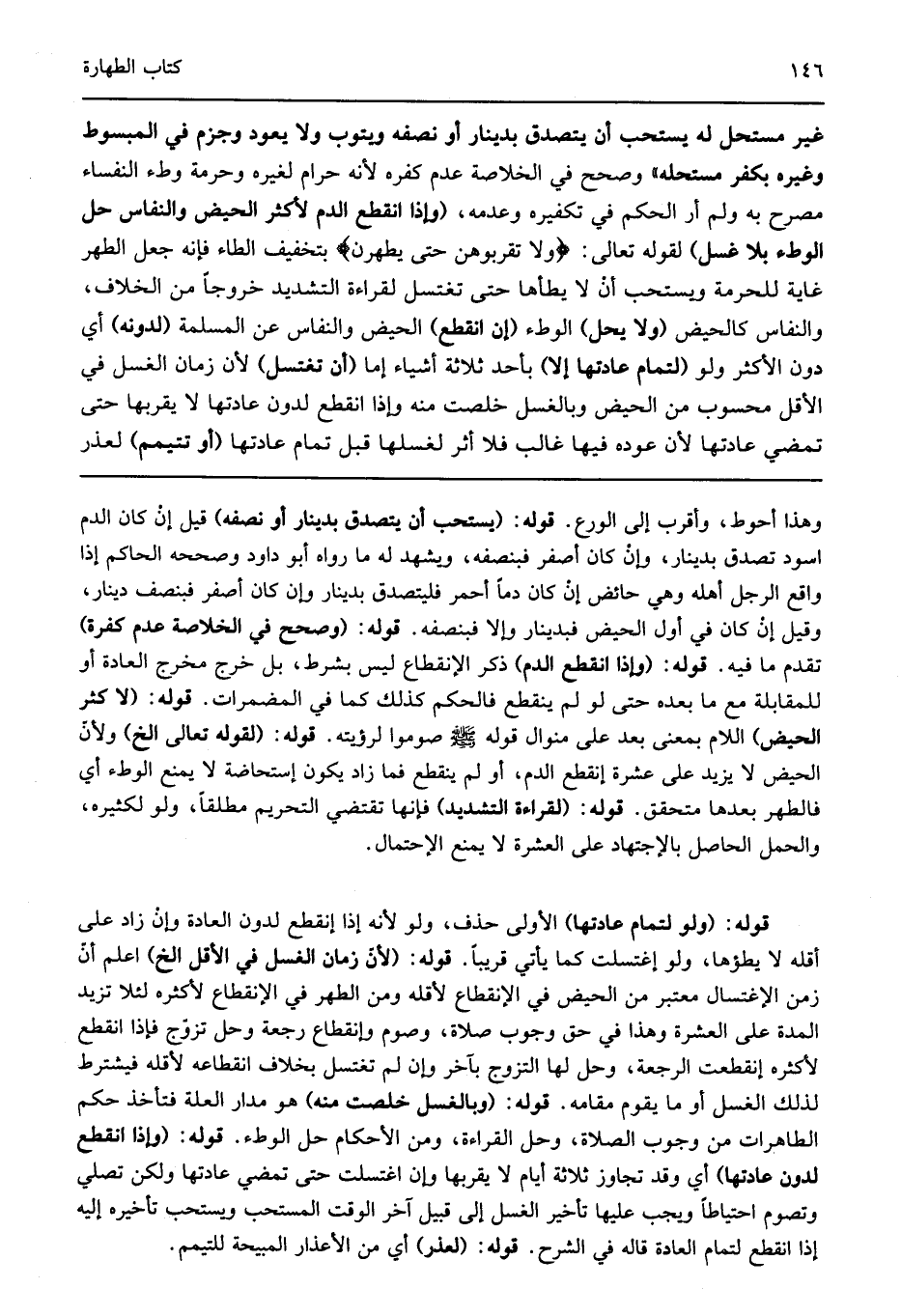 وهذا أحوط وأقرب إلى الورع قوله: "يستحب أن يتصدق بدينار أو نصفه" قيل إن كان الدم اسود تصدق بدينار وإن كان أصفر فبنصفه ويشهد له ما رواه أبو داود وصححه الحاكم إذا واقع الرجل أهله وهي حائض إن كان دما أحمر فليتصدق بدينار وإن كان أصفر فبنصف دينار وقيل إن كان في أول الحيض فبدينار وإلا فبنصفه قوله: "وصحح في الخلاصة عدم كفرة" تقدم ما فيه قوله: "وإذا انقطع الدم" ذكر الإنقطاع ليس بشرط بل خرج مخرج العادة أو للمقابلة مع ما بعده حتى لو لم ينقطع فالحكم كذلك كما في المضمرات قوله: "لا كثر الحيض" اللام بمعنى بعد على منوال قوله صلى الله عليه وسلم: "صوموا لرؤيته" قوله: "لقوله تعالى الخ" ولأن الحيض لا يزيد على عشرة إنقطع الدم أو لم ينقطع فما زاد يكون إستحاضة لا يمنع الوطء أي فالطهر بعدها متحقق قوله: "لقراءة التشديد" فإنها تقتضي التحريم مطلقا ولو لكثيره والحمل الحاصل بالإجتهاد على العشرة لا يمنع الإحتمال.