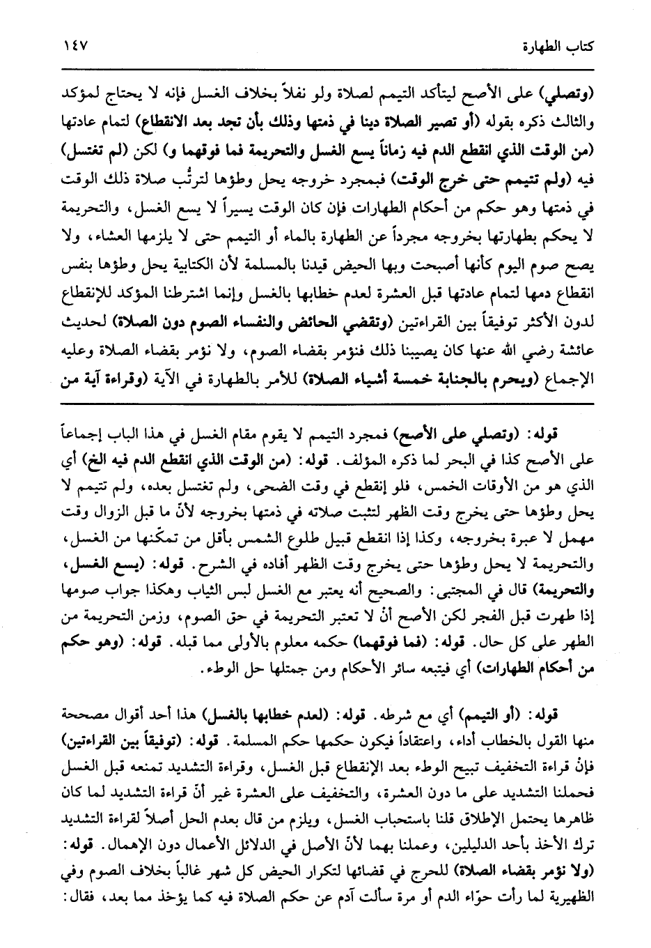 قوله: "أو التيمم" أي مع شرطه قوله: "لعدم خطابها بالغسل" هذا أحد أقوال مصححة منها القول بالخطاب أداء واعتقادا فيكون حكمها حكم المسلمة قوله: "توفيقا بين القراءتين" فإن قراءة التخفيف تبيح الوطء بعد الإنقطاع قبل الغسل وقراءة التشديد تمنعه قبل الغسل فحملنا التشديد على ما دون العشرة والتخفيف على العشرة غير أن قراءة التشديد لما كان ظاهرها يحتمل الإطلاق قلنا باستحباب الغسل ويلزم من قال بعدم الحل أصلا لقراءة التشديد ترك الأخذ بأحد الدليلين وعملنا بهما لأن الأصل في الدلائل الأعمال دون الإهمال قوله: "ولا نؤمر بقضاء الصلاة" للحرج في قضائها لتكرار الحيض كل شهر غالبا بخلاف الصوم وفي الظهيرية لما رأت حواء الدم أول مرة سألت آدم عن حكم الصلاة فيه كما يؤخذ مما بعد فقال.