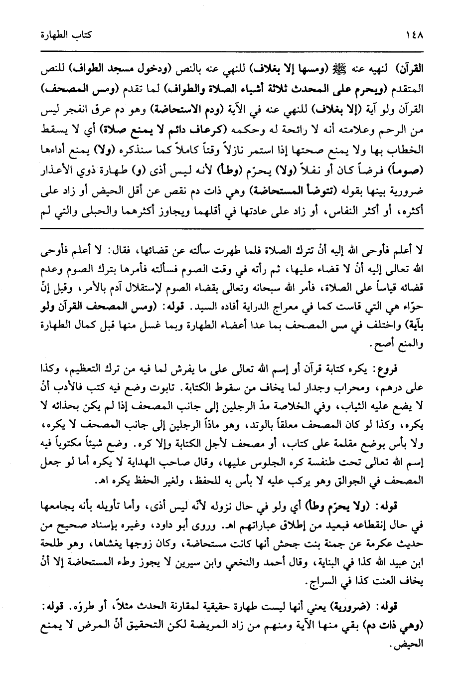 لا أعلم فأوحى الله إليه أن تترك الصلاة فلما طهرت سألته عن قضائها فقال: لا أعلم فأوحى الله تعالى إليه أن لا قضاء عليها ثم رأته في وقت الصوم فسألته فأمرها بترك الصوم وعدم قضائه قياسا على الصلاة فأمر الله سبحانه وتعالى بقضاء الصوم لإستقلال آدم بالأمر وقيل إن حواء هي التي قاست كما في معراج الدراية أفاده السيد قوله: "ومس المصحف القرآن ولو آية" واختلف في مس المصحف بما عدا أعضاء الطهارة وبما غسل منها قبل كمال الطهارة والمنع أصح.