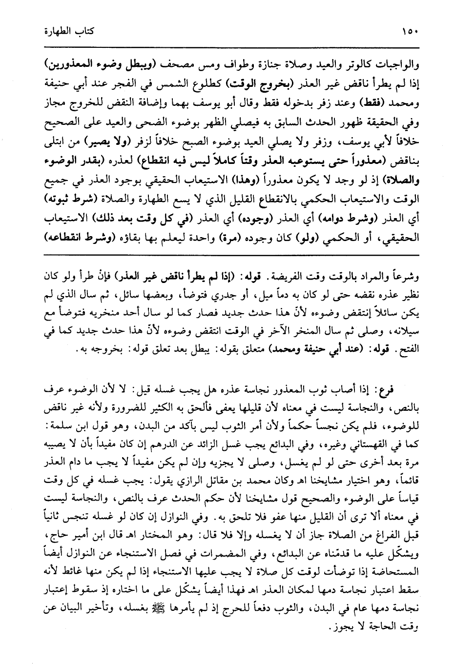 والواجبات كالوتر والعيد وصلاة جنازة وطواف ومس مصحف "ويبطل وضوء المعذورين" إذا لم يطرأ ناقض غير العذر "بخروج الوقت" كطوع الشمس في الفجر عند أبي حنيفة ومحمد "فقط" وعند زفر بدخوله فقط وقال أبو يوسف بهما وإضافة النقض للخروج مجاز وفي الحقيقة ظهور الحدث السابق به فيصلي الظهر بوضوء الضحى والعيد على الصحيح خلافا لأبي يوسف وزفر ولا يصلي العيد بوضوء الصبح خلافا لزفر "ولا يصير" من ابتلي بناقض "معذورا حتى يستوعبه العذر وقتا كاملا ليس فيه انقطاع" اعذره "بقدر الوضوء والصلاة" فلو وجد لا يكون معذورا "وهذا" الاستيعاب الحقيقي بوجود العذر في جميع الوقت والاستيعاب الحكمي بالانقطاع القليل الذي لا يسع الطهارة والصلاة "شرط ثبوته" أي العذر "وشرط دوامه" أي العذر "وجوده" أي العذر "في كل وقت بعد ذلك" الاستيعاب الحقيقي أو الحكمي "ولو" كان وجوده "مرة" واحدة ليعلم بها بقاؤه "وشرط انقطاعه"