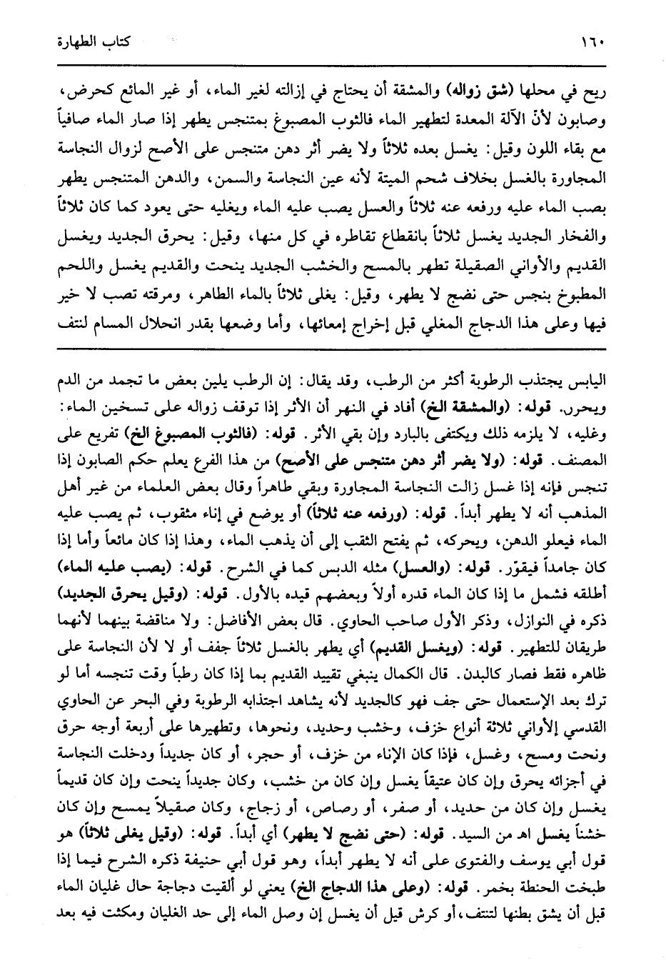 ريح في محلها "شق زواله" والمشقة أن يحتاج في إزالته لغير الماء أو غير المائع كحوض وصابون لأن الآلة المعدة للتطهير الماء فالثوب المصبوغ بمتنجس يطهر إذا صار الماء صافيا مع بقاء اللون وقيل يغسل بعده ثلاثا ولا يضر أثر دهن متنجس على الأصح بزوال النجاسة المجاورة بخلاف شحم الميتة لأنه عين النجاسة والسمن والدهن المتنجس يطهر بصب الماء عليه ورفعه عن ثلاثا والغسل يصب عليه الماء ويغليه حتى يعود كما كان ثلاثا والفخار الجديد يغسل ثلاثا بانقطاع تقاطره في كل منها وقيل يحرق الجديد ويغسل القديم والأواني الثقيلة تطهر بالمسح والخشب الجديد ينحت والقديم يغسل واللحم المطبوخ بنجس حتى نضج لا يطهر وقيل يغلي ثلاثا بالماء الطاهر ومرقته تصب لا خير فيها وعلى هذا الدجاج المغلي قبل إخراج أمعائها وأما وضعها بقدر انحلال المسام لنتف.