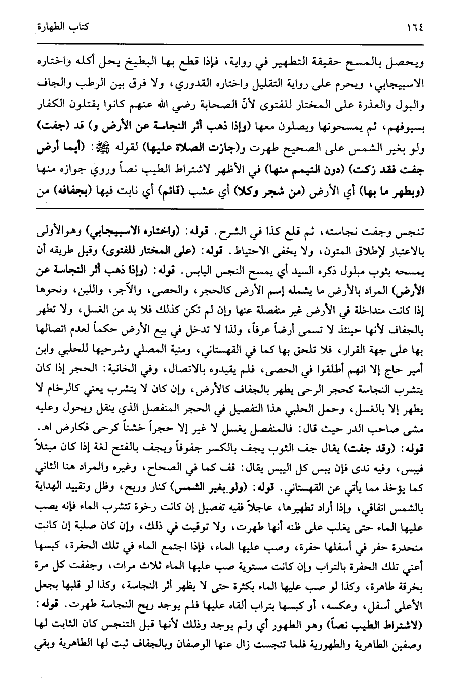 تنجس وجفت نجاسته ثم قلع كذا في الشرح قوله: "واختاره الاسبيجابي" وهوالأولى بالاعتبار لإطلاق المتون ولا يخفى الاحتياط قوله: "على المختار للفتوى" وقيل طريقه أن يمسحه بثوب مبلول ذكره السيد أي يمسح النجس اليابس قوله: "وإذا ذهب أثر النجاسة عن الأرض" المراد بالأرض ما يشمله إسم الأرض كالحجر والحصى والآجر واللبن ونحوها إذا كانت متداخلة في الأرض غير منفصلة عنها وإن لم تكن كذلك فلا بد من الغسل ولا تطهر بالجفاف لأنها حينئذ لا تسمى أرضا عرفا ولذا لا تدخل في بيع الأرض حكما لعدم اتصالها بها على جهة القرار فلا تلحق بها كما في القهستاني ومنية المصلي وشرحيها للحلبي وابن أمير حاج إلا انهم أطلقوا في الحصى فلم يقيدوه بالاتصال وفي الخانية الحجر إذا كان يتشرب النجاسة كحجر الرحى يطهر بالجفاف كالأرض وإن كان لا يتشرب يعني كالرخام لا يطهر إلا بالغسل وحمل الحلبي هذا التفصيل في الحجر المنفصل الذي ينقل ويحول وعليه مشى صاحب الدر حيث قال فالمنفصل يغسل لا غير إلا حجرا خشنا كرحى فكارض اهـ قوله: "وقد جفت" يقال جف الثوب يجف بالكسر جفوفا ويجف بالفتح لغة إذا كان مبتلا فيبس وفيه ندى فإن يبس كل اليبس يقال قف كما في الصحاح وغيره والمراد هنا الثاني كما يؤخذ مما يأتي عن القهستاني قوله: "ولو بغير الشمس" كنار وريح وظل وتقييد الهداية بالشمس اتفاقي وإذا أراد تطهيرها عاجلا ففيه تفصيل إن كانت رخوة تتشرب الماء فإنه يصب عليها الماء حتى يغلب على ظنه أنها طهرت ولا توقيت في ذلك وإن كان صلبة إن كانت منحدرة حفر في أسفلها حفرة وصب عليها الماء فإذا اجتمع الماء في تلك الحفرة كبسها أعني تلك الحفرة بالتراب وإن كانت مستوية صب عليها الماء ثلاث مرات وجففت كل مرة بخرقة طاهرة وكذا لو صب عليها الماء بكثرة حتى لا يظهر أثر النجاسة وكذا لو قلبها بجعل الأعلى أسفل وعكسه أو كبسها بتراب ألقاه عليها فلم يوجد ريح النجاسة طهرت قوله: "لاشتراط الطيب نصا" وهو الطهور أي ولم يوجد وذلك لأنها قبل التنجس كان الثابت لها وصفين الطاهرية والطهورية فلما تنجست زال عنها الوصفان وبالجفاف ثبت لها الطاهرية وبقي.