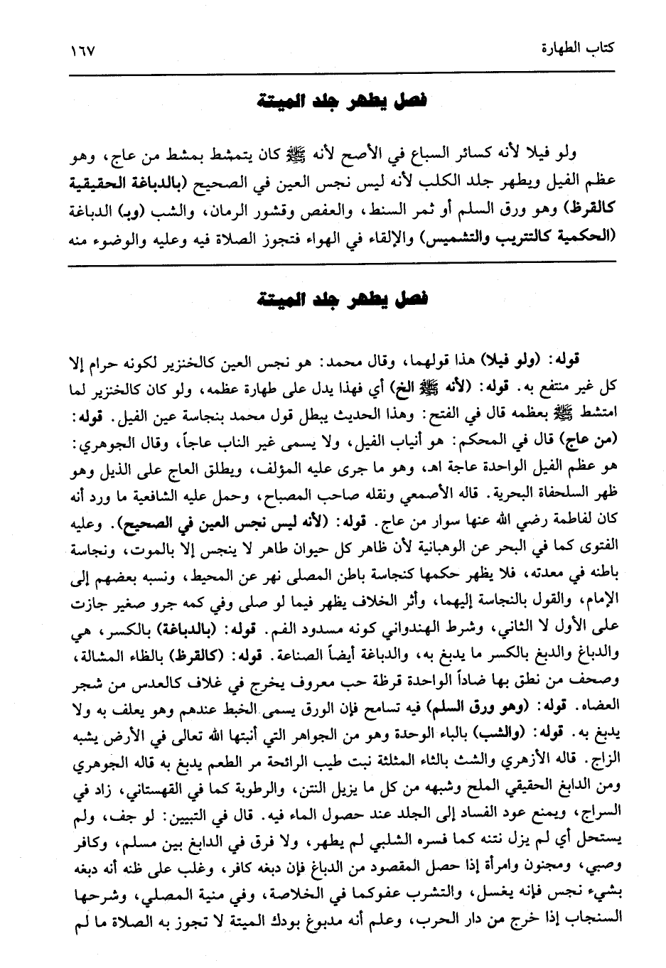 قوله: "ولو فيلا" هذا قولهما وقال محمد هو نجس العين كالخنزير لكونه حرام إلا كل غير منتفع به قوله: "لأنه صلى الله عليه وسلم الخ" أي فهذا يدل على طهارة عظمه ولو كان كالخنزير لما امتشط صلى الله عليه وسلم بعظمه قال في الفتح وهذا الحديث يبطل قول محمد بنجاسة عين الفيل قوله: "من عاج" قال في المحكم هو أنياب الفيل ولا يسمى غير الناب عاجا وقال الجوهري هو عظم الفيل الواحدة عاجة اهـ وهو ما جرى عليه المؤلف ويطلق العاج على الذيل وهو ظهر السلحفاة البحرية قاله الأصمعي ونقله صاحب المصباح وحمل عليه الشافعية ما ورد أنه كان لفاطمة رضي الله عنها سوار من عاج قوله: "لأنه ليس نجس العين في الصحيح وعليه الفتوى كما في البحر عن الوهبانية لأن ظاهر كل حيوان طاهر لا ينجس إلا بالموت ونجاسة باطنه في معدته فلا يظهر حكمها كنجاسة باطن المصلى نهر عن المحيط ونسبه بعضهم إلى الإمام والقول بالنجاسة إليهما وأثر الخلاف يظهر فيما لو صلى وفي كمه جرو صغير جازت على الأول لا الثاني وشرط الهندواني كونه مسدود الفم قوله: "بالدباغة" بالكسر هي والدباغ والدبغ بالكسر ما يدبغ به والدباغة أيضا الصناعة قوله: "كالقرظ" بالظاء المشالة وصحف من نطق بها ضادا الواحدة قرظة حب معروف يخرج في غلاف كالعدس من شجر العضاه قوله: "وهو ورق السلم" فيه تسامح فإن الورق يسمى الخبط عندهم وهو يعلف به ولا يدبغ به قوله: "والشب" بالباء الوحدة وهو من الجواهر التي أنبتها الله تعالى في الأرض يشبه الزاج قاله الأزهري والشث بالثاء المثلثة نبت طيب الرائحة مر الطعم يدبغ به قاله الجوهري ومن الدابغ الحقيقي الملح وشبهه من كل ما يزيل النتن والرطوبة كما في القهستاني زاد في السراج ويمنع عود الفساد إلى الجلد عند حصول الماء فيه قال في التبيين لو جف ولم يستحل أي لم يزل نتنه كما فسره الشلبي لم يطهر ولا فرق في الدابغ بين مسلم وكافر وصبي ومجنون وامرأة إذا حصل المقصود من الدباغ فإن دبغه كافر وغلب على ظنه أنه دبغه بشيء نجس فإنه يغسل والتشرب عفوكما في الخلاصة وفي منية المصلي وشرحها السنجاب إذا خرج من دار الحرب وعلم أنه مدبوغ بودك الميتة لا تجوز به الصلاة ما لم.