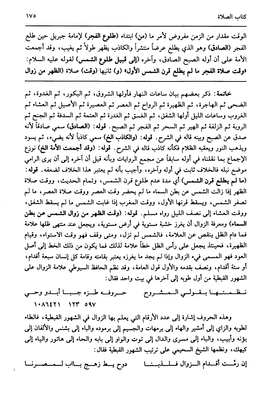 خاتمة ذكر بعضهم بيان ساعات النهار فأولها الشروق ثم البكور ثم الغدوة ثم الضحى ثم الهاجرة ثم الظهيرة ثم الرواح ثم العصر ثم العصيرة ثم الأصيل ثم العشاء ثم الغروب وساعات الليل أولها الشفق ثم الغسق ثم الغدرة ثم العتمة ثم السدفة ثم الجنح ثم الروبة ثم الزلقة ثم الهير ثم السحر ثم الفجر ثم الصبح قوله: "الصادق" سمي صادقا لأنه صدق عن الصبح وبينه قاله في الشرح قوله: "والكاذب الخ" سمي كاذبا لأنه يضيء ثم يسود ويذهب النور ويعقبه الظلام فكأنه كاذب قاله في الشرح قوله: "وقد أجمعت الأمة الخ" نوزع الإجماع بما نقلناه في أوله سابقا عن مجمع الروايات وبأنه قيل ان آخره إلى أن يرى الرامي موضع نبله فالخلاف ثابت في أوله وآخره وأجيب بأنه لم يعتبر هذا الخلاف لضعفه قوله: "ما لم يطلع قرن الشمس" أي مدة عدم طلوع قرن الشمس وتمام الحديث ووقت صلاة الظهر إذا زالت الشمس عن بطن السماء ما لم يحضر وقت العصر ووقت صلاة العصر ما لم تصفر الشمس ويسقط قرنها الأول ووقت المغرب إذا غابت الشمس ما لم يسقط الشفق ووقت العشاء إلى نصف الليل رواه مسلم قوله: "وقت الظهر من زوال الشمس عن بطن السماء" ومعرفة الزوال أن يغرز خشبة مستوية في أرض مستوية ويجعل عند منتهى ظلها علامة فما دام الظل ينقص عن العلامة فالشمس لم تزل ومتى وقف فهو وقت الاستواء وقيام الظهيرة فحينئذ يجعل على رأس الظل خطا علامة لذلك فما يكون من ذلك الخط إلى أصل العود فهو المسمى فيء الزوال وإذا لم يجد ما يغرزه يعتبر بقامته وقامة كل إنسان سبعة أقدام أو ستة أقدام ونصف بقدمه والأول قول العامة وقد نظم الحافظ السيوطي علامة الزوال على الشهور القبطية من أول طوبه إلى آخرها في بيت واحد فقال: