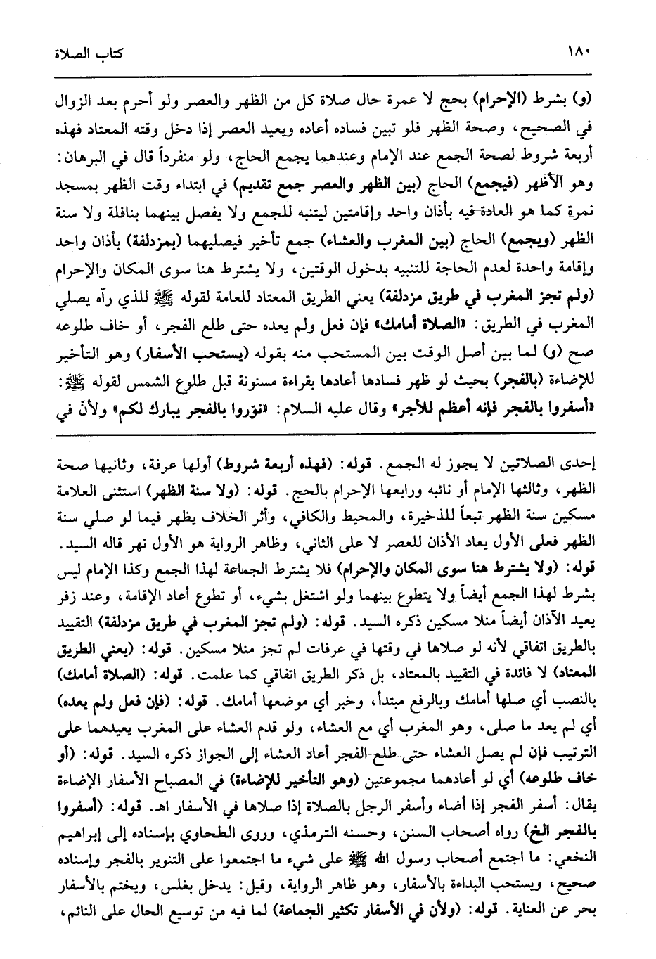 "و" بشرط "الإحرام" بحج لا عمرة حال صلاة كل من الظهر والعصر ولو أحرم بعد الزوال في الصحيح وصحة الظهر فلو تبين فساده أعاد. ويعيد العصر إذا دخل وقته المعتاد فهذه أربعة شروط لصحة الجمع عند الإمام وعندهما يجمع الحاج ولو منفردا قال في البرهان وهو الأظهر "فيجمع" الحاج "بين الظهر والعصر جمع تقديم" في ابتداء وقت الظهر بمسجد نمرة كما هو العادة فيه بأذان واحد وإقامتين ليتنبه للجمع ولا يفصل بينهما بنافلة ولا سنة الظهر "ويجمع" الحاج "بين المغرب والعشاء" جمع تأخير فيصليهما "بمزدلفة" بأذان واحد وإقامة واحدة لعدم الحاجة للتنبيه بدخول الوقتين ولا يشترط هنا سوى المكان والإحرام "ولم تجز المغرب في طريق مزدلفة" يعني الطريق المعتاد للعامة لقوله صلى الله عليه وسلم للذي رآه يصلي المغرب في الطريق: "الصلاة أمامك" فإن فعل ولم يعده حتى طلع الفجر أو خاف طلوعه صح "و" لما بين أصل الوقت بين المستحب منه بقوله: "يستحب الإسفار" وه التأخير للإضاءة "بالفجر" بحيث لو ظهر فسادها أعادها بقراءة مسنونة قبل طلوع الشمس لقوله صلى الله عليه وسلم: "أسفروا بالفجر فإنه أعظم للأجر" وقال عليه السلام: "نوروا بالفجر يبارك لكم " ولأن في