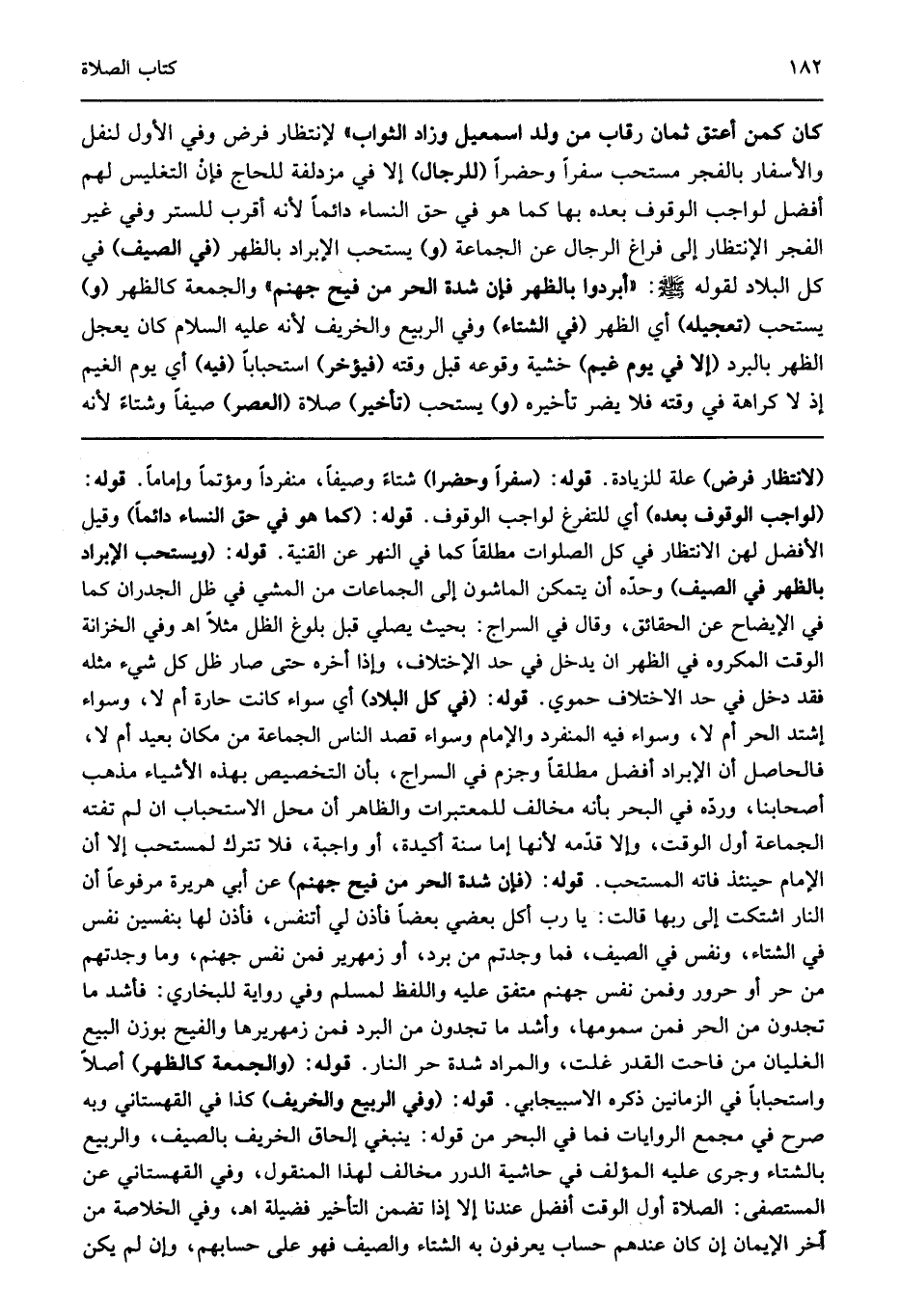 "لانتظار فرض" علة للزيادة قوله: "سفرا وحضرا" شتاء وصيفا منفردا ومؤتما وإماما قوله: "لواجب الوقوف بعده" أي للتفرغ لواجب الوقوف قوله: "كما هو في حق النساء دائما" وقيل الأفضل لهن الانتظار في كل الصلوات مطلقا كما في النهر عن القنية قوله: "ويستحب الإبراد بالظهر في الصيف" وحده أن يتمكن الماشون إلى الجماعات من المشي في ظل الجدران كما في الإيضاح عن الحقائق وقال في السراج بحيث يصلي قبل بلوغ الظل مثلا اهـ وفي الخزانة الوقت المكروه في الظهر ان يدخل في حد الإختلاف وإذا أخره حتى صار ظل كل شيء مثله فقد دخل في حد الاختلاف حموي قوله: "في كل البلاد" أي سواء كانت حارة أم لا وسواء إشتد الحر أم لا وسواء فيه المنفرد والإمام وسواء قصد الناس الجماعة من مكان بعيد أم لا فالحاصل أن الإبراد أفضل مطلقا وجزم في السراج بأن التخصيص بهذه الأشياء مذهب أصحابنا ورده في البحر بأنه مخالف للمعتبرات والظاهر أن محل الاستحباب ان لم تفته الجماعة أول الوقت وإلا قدمه لأنها إما سنة أكيدة أو واجبة فلا تترك لمستحب إلا أن الإمام حينئذ فاته المستحب قوله: "فإن شدة الحر من فيح جهنم" عن أبي هريرة مرفوعا "أن النار اشتكت إلى ربها قالت يا رب أكل بعضي بعضا فأذن لي أتنفس فأذن لها بنفسين نفس في الشتاء ونفس في الصيف فما وجدتم من برد أو زمهرير فمن نفس جهنم وما وجدتهم من حر أو حرور وفمن نفس جهنم" متفق عليه واللفظ لمسلم وفي رواية للبخاري فأشد ما تجدون من الحر فمن سمومها وأشد ما تجدون من البرد فمن زمهريرها والفيح بوزن البيع الغليان من فاحت القدر غلت والمراد شدة حر النار قوله: "والجمعة كالظهر" أصلا واستحبابا في الزمانين ذكره الاسبيجابي قوله: "وفي الربيع والخريف" كذا في القهستاني وبه صرح في مجمع الروايات فما في البحر من قوله ينبغي إلحاق الخريف بالصيف والربيع بالشتاء وجرى عليه المؤلف في حاشية الدرر مخالف لهذا المنقول وفي القهستاني عن المستصفى الصلاة أول الوقت أفضل عندنا إلا إذا تضمن التأخير فضيلة اهـ وفي الخلاصة من آخر الإيمان إن كان عندهم حساب يعرفون به الشتاء والصيف فهو على حسابهم وإن لم يكن.