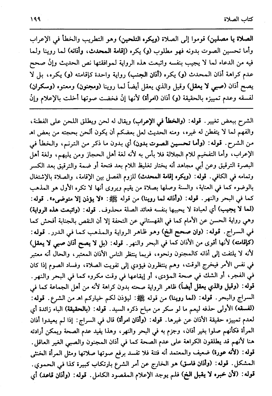 الصلاة يا مصلين" قوموا إلى الصلاة "ويكره التلحين" وهو التطريب والخطأ في الإعراب وأما تحسين الصوت بدونه فهو مطلوب "و" يكره "إقامة المحدث وأذانه" لما روينا ولما فيه من الدعاء لما لا يجيب بنفسه واتبعت هذه الرواية لموافقتها نص الحديث وإن صحح عدم كراهة أذان المحدث "و" يكره "أذان الجنب" رواية واحدة كإقامته "و" يكره بل لا يصح أذان "صبي لا يعقل" وقيل والذي يعقل أيضا لما روينا "ومجنون" ومعتوه "وسكران" لفسقه وعدم تمييزه بالحقيقية "و" أذان "امرأة" لأنها إن خفضت صوتها أخلت بالإعلام وإن