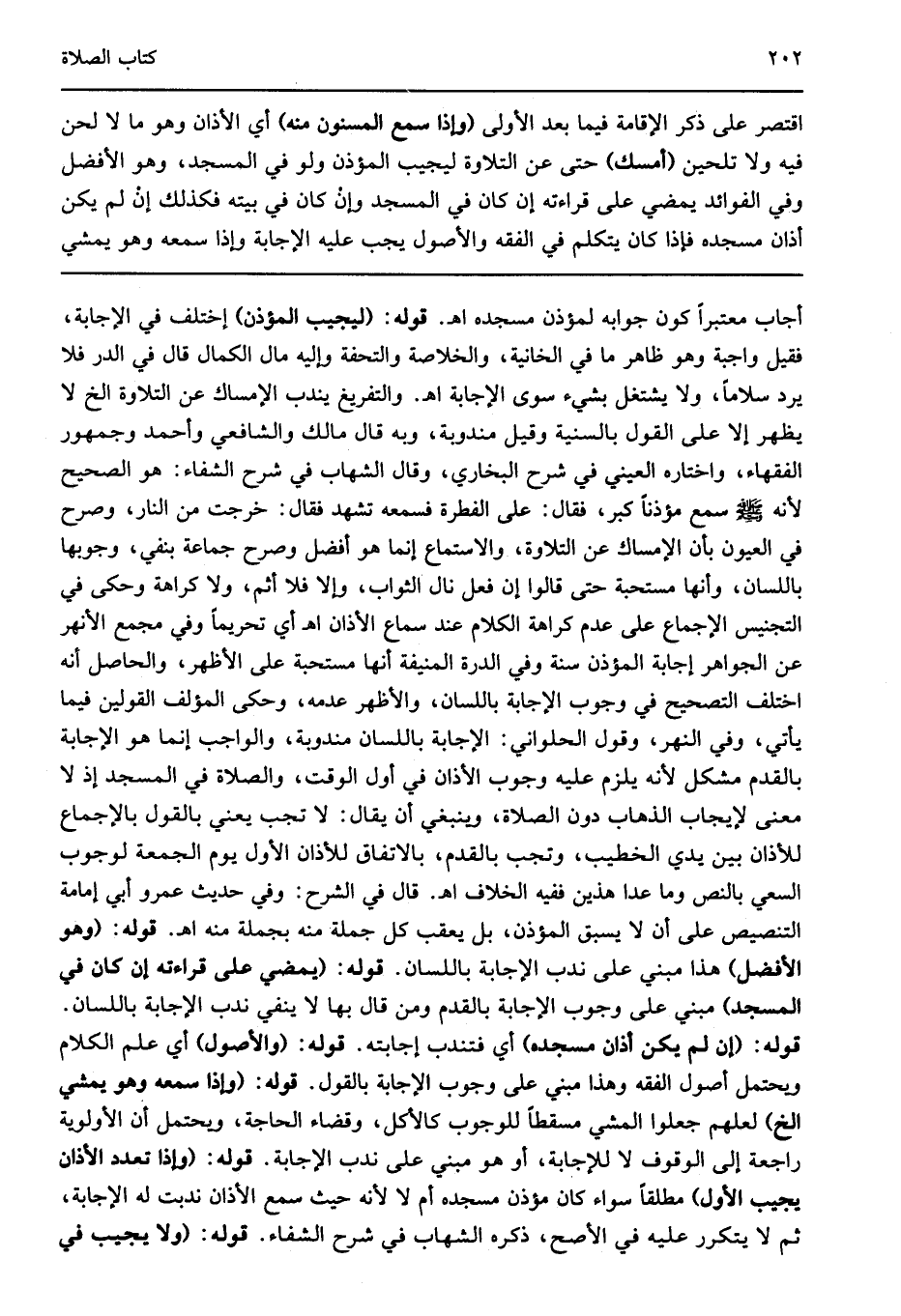 أجاب معتبرا كون جوابه لمؤذن مسجده اهـ قوله: "ليجيب المؤذن" إختلف في الإجابة فقيل واجبة وهو ظاهر ما في الخانية والخلاصة والتحفة وإليه مال الكمال قال في الدر فلا يرد سلاما ولا يشتغل بشيء سوى الإجابة اهـ والتفريغ يندب الإمساك عن التلاوة الخ لا يظهر إلا على القول بالسنية وقيل مندوبة وبه قال مالك والشافعي وأحمد وجمهور الفقهاء واختاره العيني في شرح البخاري وقال الشهاب في شرح الشفاء هو الصحيح لأنه صلى الله عليه وسلم سمع مؤذنا كبر فقال: على الفطرة فسمعه تشهد فقال: خرجت من النار وصرح في العيون بأن الإمساك عن التلاوة والاستماع إنما هو أفضل وصرح جماعة بنفي وجوبها باللسان وأنها مستحبة حتى قالوا: إن فعل نال الثواب وإلا فلا أثم ولا كراهة وحكى في التجنيس الإجماع على عدم كراهة الكلام عند سماع الأذان اهـ أي تحريما وفي مجمع الأنهر عن الجواهر إجابة المؤذن سنة وفي الدرة المنيفة أنها مستحبة على الأظهر والحاصل أنه اختلف التصحيح في وجوب الإجابة باللسان والأظهر عدمه وحكى المؤلف القولين فيما يأتي وفي النهر وقول الحلواني الإجابة باللسان مندوبة والواجب إنما هو الإجابة بالقدم مشكل لأنه يلزم عليه وجوب الأذان في أول الوقت والصلاة في المسجد إذ لا معنى لإيجاب الذهاب دون الصلاة وينبغي أن يقال لا تجب يعني بالقول بالإجماع للأذان بين يدي الخطيب وتجب بالقدم بالاتفاق للأذان الأول يوم الجمعة لوجوب السعي بالنص وما عدا هذين ففيه الخلاف اهـ قال في الشرح وفي حديث عمرو أبي إمامة التنصيص على أن لا يسبق المؤذن بل يعقب كل جملة منه بجملة منه اهـ قوله: "وهو الأفضل" هذا مبني على ندب الإجابة باللسان قوله: "يمضي على قراءته إن كان في المسجد" مبني على وجوب الإجابة بالقدم ومن قال بها لا ينفي ندب الإجابة باللسان قوله: "إن لم يكن أذان مسجده" أي فتندب إجابته قوله: "والأصول" أي علم الكلام ويحتمل أصول الفقه وهذا مبني على وجوب الإجابة بالقول قوله: "وإذا سمعه وهو يمشي الخ" لعلهم جعلوا المشي مسقطا للوجوب كالأكل وقضاء الحاجة ويحتمل أن الأولوية راجعة إلى الوقوف لا للإجابة أو هو مبني على ندب الإجابة قوله: "وإذا تعدد الأذان يجيب الأول" مطلقا سواء كان مؤذن مسجده أم لا لأنه حيث سمع الأذان ندبت له الإجابة ثم لا يتكرر عليه في الأصح ذكره الشهاب في شرح الشفاء قوله: "ولا يجيب في