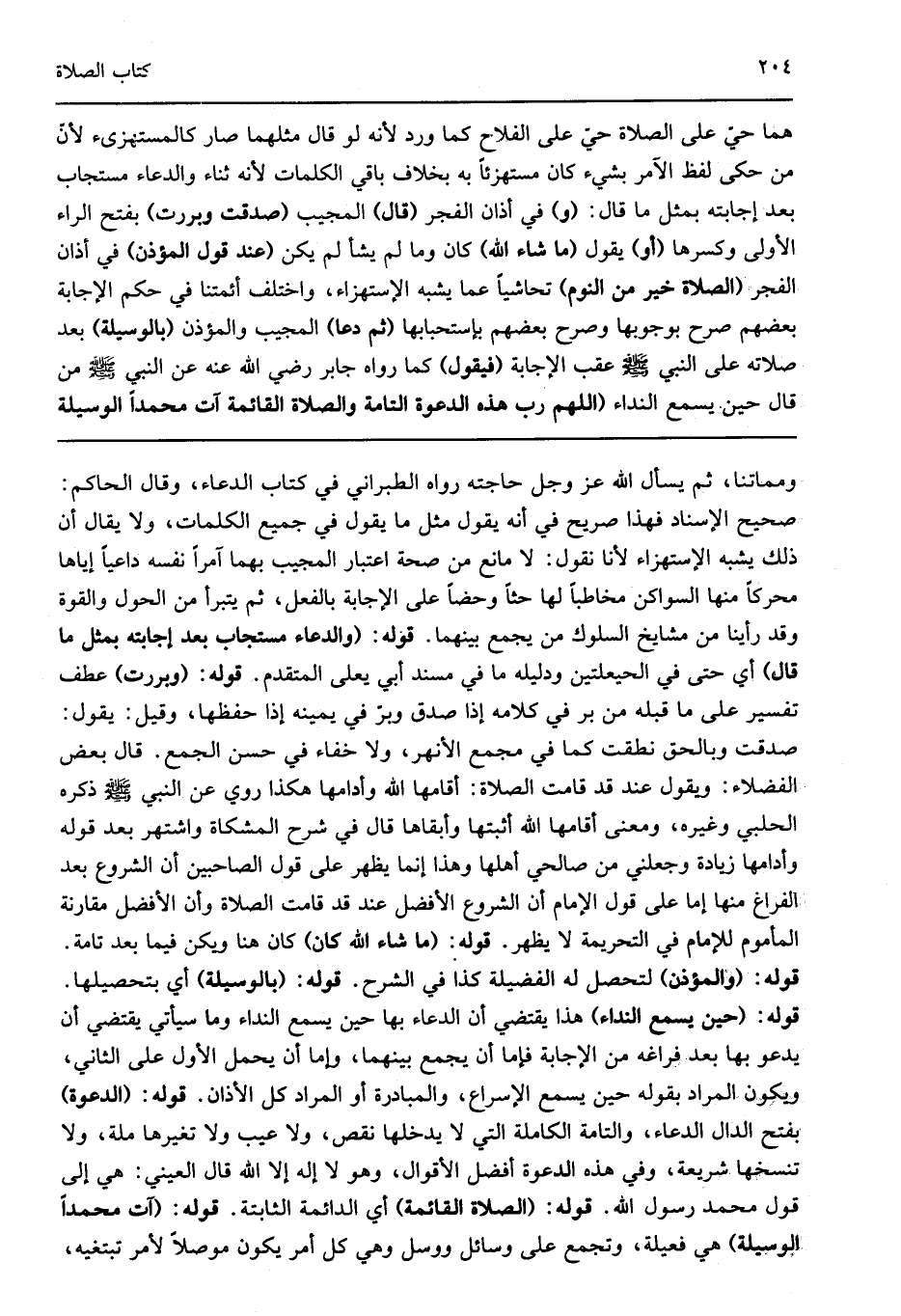 ومماتنا ثم يسأل الله عز وجل حاجته" رواه الطبراني في كتاب الدعاء وقال الحاكم صحيح الإسناد فهذا صريح في أنه يقول مثل ما يقول في جميع الكلمات ولا يقال أن ذلك يشبه الإستهزاء لأنا نقول لا مانع من صحة اعتبار المجيب بهما آمرا نفسه داعيا إياها محركا منها السواكن مخاطبا لها حثا وحضا على الإجابة بالفعل ثم يتبرأ من الحول والقوة وقد رأينا من مشايخ السلوك من يجمع بينهما قوله: "والدعاء مستجاب بعد إجابته بمثل ما قال" أي حتى في الحيعلتين ودليله ما في مسند أبي يعلى المتقدم قوله: "وبررت" عطف تفسير على ما قبله من بر في كلامه إذا صدق وبر في يمينه إذا حفظها وقيل يقول صدقت وبالحق نطقت كما في مجمع الأنهر ولا خفاء في حسن الجمع قال بعض الفضلاء ويقول عند قد قامت الصلاة أقامها الله وأدامها هكذا روي عن النبي صلى الله عليه وسلم ذكره الحلبي وغيره ومعنى أقامها الله أثبتها وأبقاها قال في شرح المشكاة واشتهر بعد قوله وأدامها زيادة وجعلني من صالحي أهلها وهذا إنما يظهر على قول الصاحبين ان الشروع بعد الفراغ منها أما على قول الإمام أن الشروع الأفضل عند قد قامت الصلاة وان الأفضل مقارنة المأموم للإمام في التحريمة لا يظهر قوله: "ما شاء الله كان" كان هنا ويكن فيما بعد تامة قوله: "والمؤذن" لتحصل له الفضيلة كذا في الشرح قوله: "بالوسيلة" أي بتحصيلها قوله: "حين يسمع النداء" هذا يقتضي ان الدعاء بها حين يسمع النداء وما سيأتي يقتضي أن يدعو بها بعد فراغه من الإجابة فأما ان يجمع بينهما وإما أن يحمل الأول على الثاني ويكون المراد بقوله حين يسمع الإسراع والمبادرة أو المراد كل الأذان قوله: "الدعوة" بفتح الدال الدعاء والتامة الكاملة التي لا يدخلها نقص ولا عيب ولا تغيرها ملة ولا تنسخها شريعة وفي هذه الدعوة أفضل الأقوال وهو لا إله إلا الله قال العيني هي إلى قول محمد رسول الله قوله: "الصلاة القائمة" أي الدائمة الثابتة قوله: "آت محمدا الوسيلة" هي فعيلة وتجمع على وسائل ووسل وهي كل أمر يكون موصلا لأمر تبتغيه