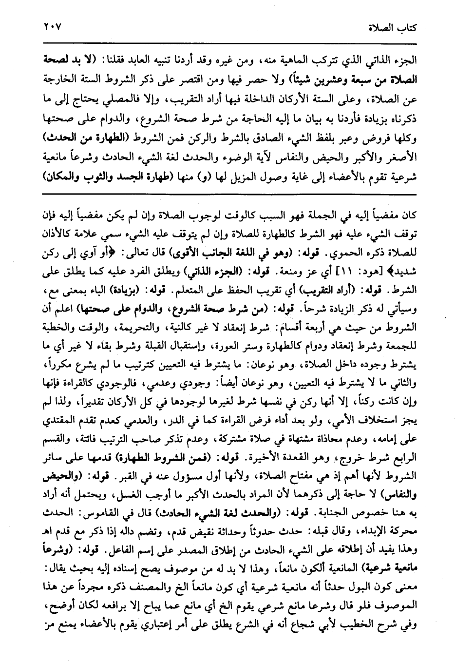 كان مفضيا إليه في الجملة فهو السبب كالوقت لوجوب الصلاة وإن لم يكن مفضيا إليه فإن توقف الشيء عليه فهو الشرط كالطهارة للصلاة وإن لم يتوقف عليه الشيء سمي علامة كالأذان للصلاة ذكره الحموي قوله: "وهو في اللغة الجانب الأقوى" قال تعالى: {أَوْ آوِي إِلَى رُكْنٍ شَدِيدٍ} [هود: 80] أي عز ومنعة قوله: "الجزء الذاتي" ويطلق الفرد عليه كما يطلق على الشرط قوله: "أراد التقريب" أي تقريب الحفظ على المتعلم قوله: "بزيادة" الباء بمعنى مع وسيأتي له ذكر الزيادة شرحا قوله: "من شرط صحة الشروع والدوام على صحتها" اعلم أن الشروط من حيث هي أربعة أقسام شرط إنعقاد لا غير كالنية والتحريمة والوقت والخطبة للجمعة وشرط إنعقاد ودوام كالطهارة وستر العورة وإستقبال القبلة وشرط بقاء لا غير أي ما يشترط وجوده داخل الصلاة وهو نوعان ما يشترط فيه التعيين كترتيب ما لم يشرع مكررا والثاني ما لا يشترط فيه التعيين وهو نوعان أيضا وجودي وعدمي فالوجودي كالقراءة فإنها وإن كانت ركنا إلا أنها ركن في نفسها شرط لغيرها لوجودها في كل الأركان تقديرا ولذا لم يجز استخلاف الأمي ولو بعد أداء فرض القراءة كما في الدر والعدمي كعدم تقدم المقتدي على إمامه وعدم محاذاة مشتهاة في صلاة مشتركة وعدم تذكر صاحب الترتيب فائتة والقسم الرابع شرط خروج وهو القعدة الأخيرة قوله: "فمن الشروط الطهارة" قدمها على سائر الشروط لأنها أهم إذ هي مفتاح الصلاة ولأنها أول مسؤول عنه في القبر قوله: "والحيض والنفاس" لا حاجة إلى ذكرهما لأن المراد بالحدث الأكبر ما أوجب الغسل ويحتمل أنه أراد به هنا خصوص الجنابة قوله: "والحدث لغة الشيء الحادث" قال في القاموس الحدث محركة الإبداء وقال قبله حدث حدوثا وحداثة نقيض قدم وتضم داله إذا ذكر مع قدم اهـ وهذا يفيد أن إطلاقه على الشيء الحادث من إطلاق المصدر على إسم الفاعل قوله: "وشرعا مانعية شرعية" المانعية ألكون مانعا وهذا لا بد له من موصوف يصح إسناده إليه بحيث يقال معنى كون البول حدثا أنه مانعية شرعية أي كون مانعا الخ والمصنف ذكره مجردا عن هذا الموصوف فلو قال وشرعا مانع شرعي يقوم الخ أي مانع عما يباح إلا برافعه لكان أوضح وفي شرح الخطيب لأبي شجاع أنه في الشرع يطلق على أمر إعتباري يقوم بالأعضاء يمنع من