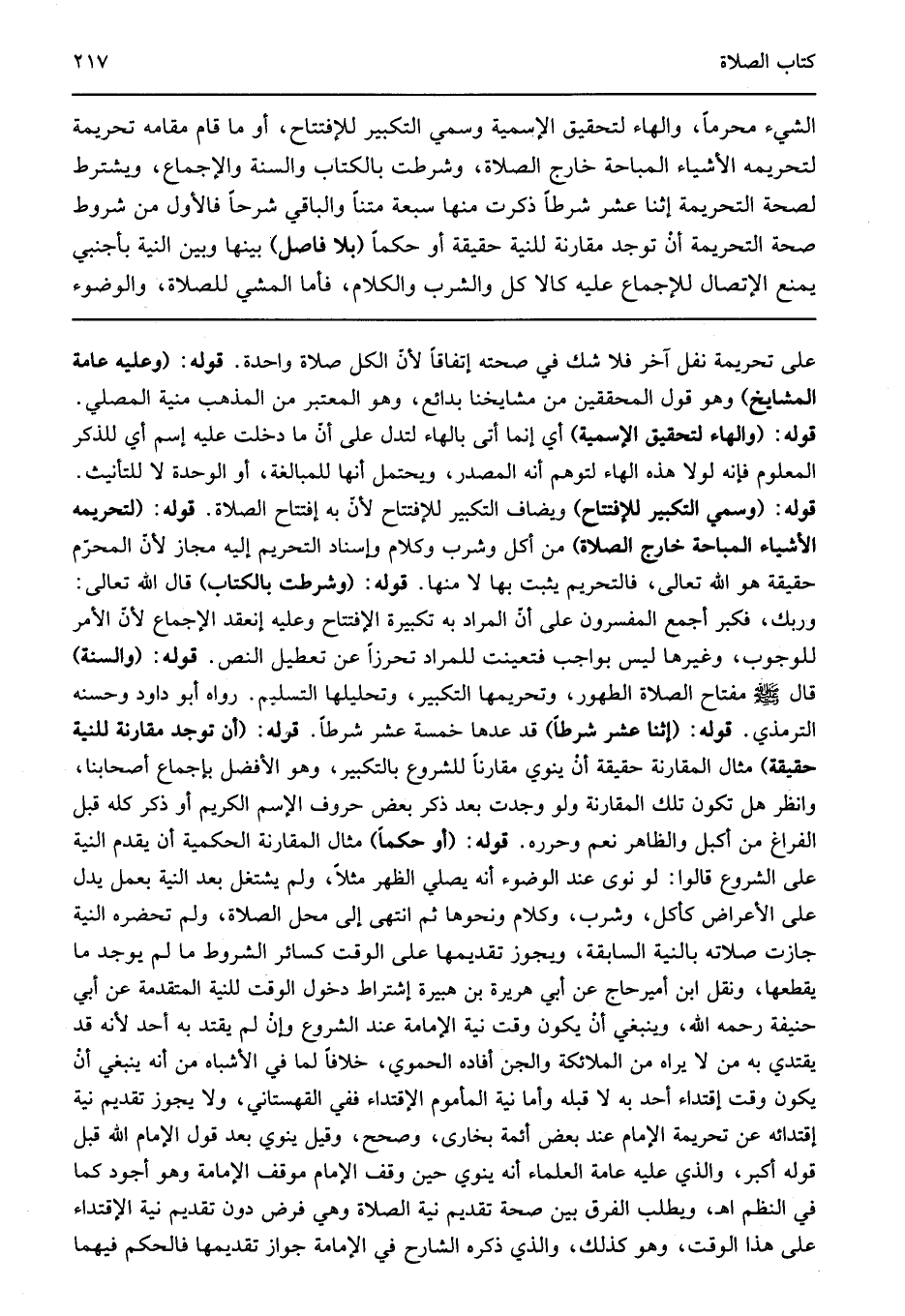 على تحريمة نفل آخر فلا شك في صحته إتفاقا لأن الكل صلاة واحدة قوله: "وعليه عامة المشايخ" وهو قول المحققين من مشايخنا بدائع وهو المعتبر من المذهب منية المصلي قوله: "والهاء لتحقيق الإسمية" أي إنما أتى بالهاء لتدل على أن ما دخلت عليه إسم أي للذكر المعلوم فإنه لولا هذه الهاء لتوهم أنه المصدر ويحتمل أنها للمبالغة أو الوحدة لا للتأنيث قوله: "وسمي التكبير للإفتتاح" ويضاف التكبير للإفتتاح لأن به إفتتاح الصلاة قوله: "لتحريمه الأشياء المباحة خارج الصلاة" من أكل وشرب وكلام وإسناد التحريم إليه مجاز لأن المحرم حقيقة هو الله تعالى فالتحريم يثبت بها لا منها قوله: "وشرطت بالكتاب" قال الله تعالى وربك فكبر أجمع المفسرون على أن المراد به تكبيرة الإفتتاح وعليه إنعقد الإجماع لأن الأمر للوجوب وغيرها ليس بواجب فتعينت للمراد تحرزا عن تعطيل النص قوله: "والسنة" قال صلى الله عليه وسلم "مفتاح الصلاة الطهور وتحريمها التكبير وتحليلها التسليم" رواه أبو داود وحسنه الترمذي قوله: "إثنا عشر شرطا" قد عدها خمسة عشر شرطا قوله: "أن توجد مقارنة للنية حقيقة" مثال المقارنة حقيقة أن ينوي مقارنا للشروع بالتكبير وهو الأفضل بإجماع أصحابنا وانظر هل تكون تلك المقارنة ولو وجدت بعد ذكر بعض حروف الإسم الكريم أو ذكر كله قبل الفراغ من أكبل والظاهر نعم وحرره قوله: "أو حكما" مثال المقارنة الحكمية أن يقدم النية على الشروع قالوا: لو نوى عند الوضوء أنه يصلي الظهر مثلا ولم يتشغل بعد النية بعمل يدل على الأعراض كأكل وشرب وكلام ونحوها ثم انتهى إلى محل الصلاة ولم تحضره النية جازت صلاته بالنية السابقة ويجوز تقديمها على الوقت كسائر الشروط ما لم يوجد ما يقطعها ونقل ابن أميرحاج عن أبي هريرة بن هبيرة إشتراط دخول الوقت للنية المتقدمة عن أبي حنيفة رحمه الله وينبغي أن يكون وقت نية الإمامة عند الشروع وإن لم يقتد به أحد لأنه قد يقتدي به من لا يراه من الملائكة والجن أفاده الحموي خلافا لما في الأشباه من أنه ينبغي أن يكون وقت إقتداء أحد به لا قبله وأما نية المأموم الإقتداء ففي القهستاني ولا يجوز تقديم نية إقتدائه عن تحريمة الإمام عند بعض أئمة بخاري وصحح وقيل ينوي بعد قول الإمام الله قبل قوله أكبر والذي عليه عامة العلماء أنه ينوي حين وقف الإمام موقف الإمامة وهو أجود كما في النظم اهـ ويطلب الفرق بين صحة تقديم نية الصلاة وهي فرض دون تقديم نية الإقتداء على هذا الوقت وهو كذلك والذي ذكره الشارح في الإمامة جواز تقديمها فالحكم فيهما