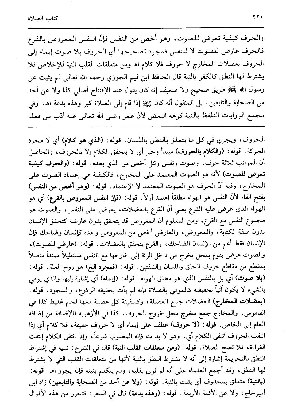 الحروف ويجري في كل ما يتعلق بالنطق باللسان قوله: "الذي هو كلام" أي لا مجرد الحركة قوله: "والكلام بالحروف" مبتدأ وخبر أي لا يتحقق الكلام إلا بالحروف والحاصل أن المراتب ثلاثة حرف وصوت ونفس وكل أخص من الذي بعده قوله: "والحرف كيفية تعرض للصوت" لأنه هو الصوت المعتمد على المخارج فالكيفية هي إعتماد الصوت على المخارج وفيه أن الحرف هو الصوت المعتمد لا الإعتماد قوله: "وهو أخص من النفس" بفتح الفاء لأن النفس هو الهواء مطلقا اعتمد أولا قوله: "فإن النفس المعروض بالقرع" أي هو الهواء الذي عرض عليه القرع يعني أن القرع بالعضلات يعرض على النفس والصوت هو مجموع النفس مع القرع ومن المعلوم أن المعروض قد يتحقق بدون عارضه كتحقق الإنسان بدون صفة الكتابة والمعروض والعارض أخص من المعروض وحده كإنسان وضاحك فإن الإنسان فقط أعم من الإنسان الضاحك والقرع يتحقق بالعضلات قوله: "عارض للصوت" والصوت عرض يقوم بمحل يخرج من داخل الرئة إلى خارجها مع النفس مستطيلا ممتدا متصلا بمقطع من مقاطع حروف الحلق واللسان والشفتين قوله: "فمجرد الخ" هو روح العلة قوله: "بلا صوت" أي بل بالنفس الذي هو مطلق الهواء قوله: "إيماء" أي إشارة إليها والذي يومي بالشي لا يكون آتيا بحقيقته كالمومي بالصلاة فإنه لم يأت بحقيقة الركوع والسجود قوله: "بعضلات المخارج" العضلات جمع العضلة وكسفينة كل عصبة معها لحم غليظ كذا في القاموس والمخارج جمع مخرج محل خروج الحروف كذا في الأزهرية فالإضافة من إضافة العام إلى الخاص قوله: "لا حروف" عطف على إيماء أي لا حروف حقيقة فلا كلام أي إذا انتفت الحروف انتفى الكلام أي وهو لا بد منه فإنه المطلوب شرعا وإذا انتفى الكلام إنتفت القراءة فلا تصح الصلاة قوله: "ومن متعلقات القلب النية" قال في الشرح تنبيه في إشتراط النطق بالتحريمة إشارة إلى أنه لا يشترط النطق بالنية لأنها من متعلقات القلب التي لا يشترط لها النطق وقد أجمع العلماء على أنه لو نوى بقلبه ولم يتكلم بنيته فإنه يجوز اهـ قوله: "بالنية" متعلق بمحذوف أي يثبت بالنية قوله: "ولا عن أحد من الصحابة والتابعين" زاد ابن أميرحاج ولا عن الأئمة الأربعة قوله: "وهذه بدعة" قال في البحر فتحرر من هذه الأقوال