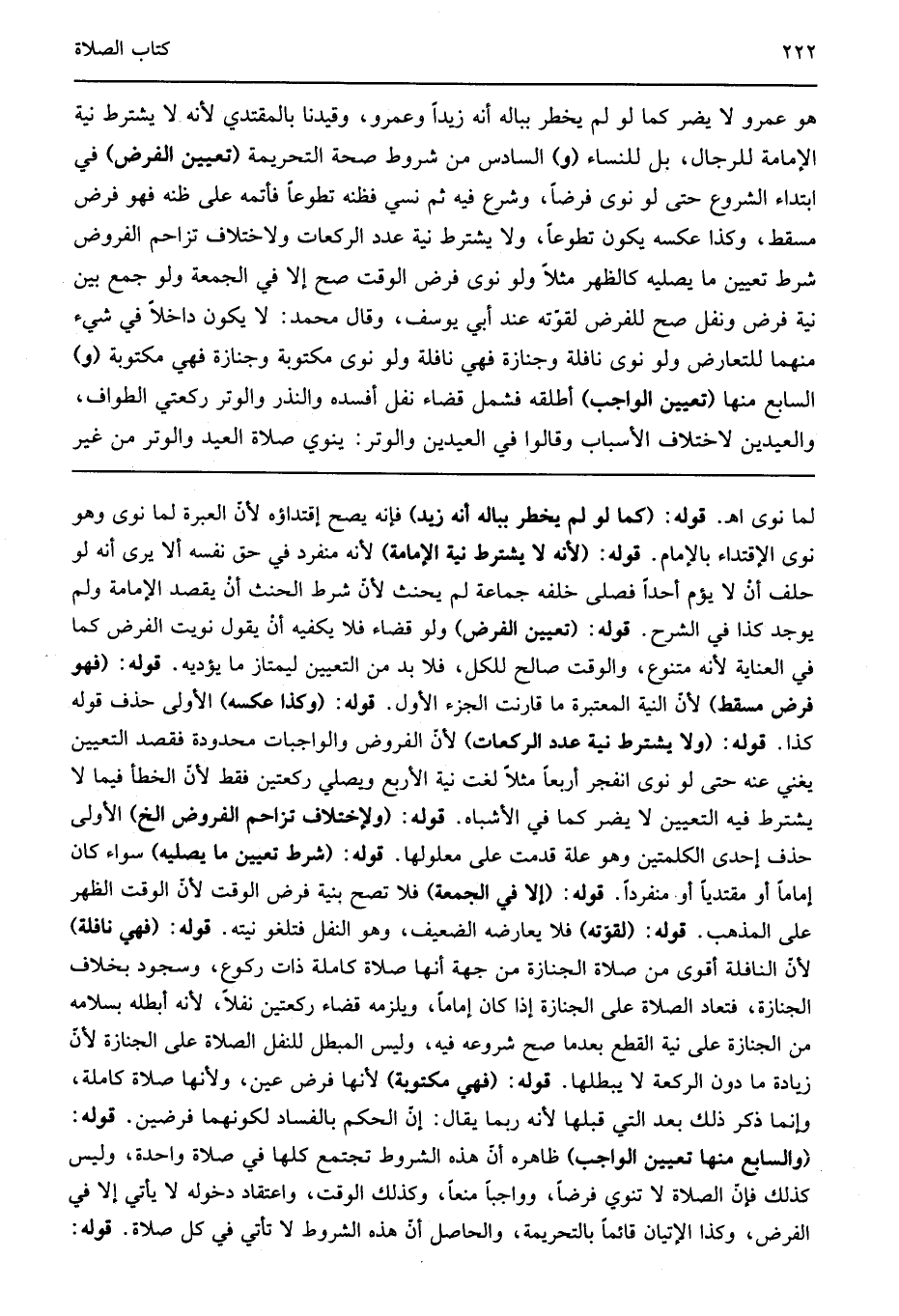 هو عمرو لا يضر كما لو لم يخطر بباله أنه زيد أو عمرو وقيدنا بالمقتدي لأنه لا يشترط نية الإمامة للرجال بل للنساء "و" السادس من شروط صحة التحريمة "تعيين الفرض" في ابتداء الشروع حتى لو نوى فرضا وشرع فيه ثم نسي فظنه تطوعا فأتمه على ظنه فهو فرض مسقط وكذا عكسه يكون تطوعا ولا يشترط نية عدد الركعات ولاختلاف تزاحم الفروض شرط تعيين ما يصليه كالظهر مثلا ولو نوى فرض الوقت صح إلا في الجمعة ولو جمع بين نية فرض ونفل صح للفرض لقوته عند أبي يوسف وقال محمد لا يكون داخلا في شيء منهما للتعارض ولو نوى نافلة وجنازة فهي نافلة ولو نوى مكتوبة وجنازة فهي مكتوبة "و" السابع منها "تعيين الواجب" أطلقه فشمل قضاء نفل أفسده والنذر والوتر وركعتي الطواف والعيدين لاختلاف الأسباب وقالوا: في العيدين والوتر ينوي صلاة العيد والوتر من غير