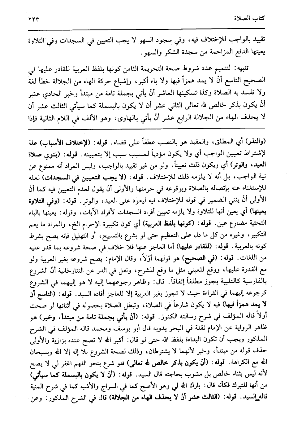 "تنبيه" لتتميم عدد شروط صحة التحريمة: الثامن كونها بلفظ العربية للقادر عليها في الصحيح. التاسع أن لا يمد همزا فيها ولا باء أكبر وإشباع حركة الهاء من الجلالة خطأ لغة ولا تفسد به الصلاة وكذا تسكينها. العاشر أن يأتي بجملة تامة من مبتدأ وخبر. الحادي عشر أن يكون بذكر خالص لله. الثاني عشر أن لا يكون بالبسملة كما سيأتي. الثالث عشر أن لا يحذف الهاء من الجلالة. الرابع عشر أن يأتي بالهاوي وهو الألف في اللام الثانية فإذا