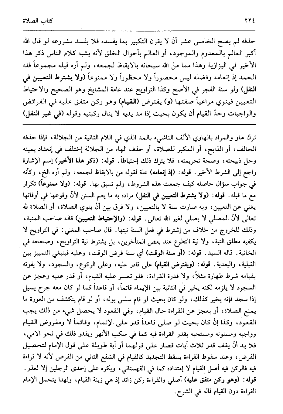 ترك هاو والمراد بالهاوي الألف الناشيء بالمد الذي في اللام الثانية من الجلالة فإذا حذفه الحالف أو الذابح أو المكبر للصلاة أو حذف الهاء من الجلالة إختلف في إنعقاد يمينه وحل ذبيحته وصحة تحريمته فلا يترك ذلك إحتياطا قوله: "ذكر هذا الأخير" إسم الإشارة راجع إلى الشرط الأخير قوله: "إذ إنعامه" علة لقوله من بالايقاظ لجمعه ولم أره الخ وكأنه في جواب سؤال حاصله كيف جمعت هذه الشروط ولم تسبق بها قوله: "ولا ممنوعا" تكرار مع ما قبله قوله: "ولا يشترط التعيين في النفل" مراده به ما يعم السنن لأن وقوعها في أوقاتها يغني عن التعيين وبه صارت سنة لا بالتعيين ولا فرق بين أن ينوي الصلاة أو الصلاة لله تعالى لأن المصلي لا يصلي لغير الله تعالى قوله: "والإحتياط التعيين" قاله صاحب المنية وذلك للخروج من خلاف من إشترط في فعل السنة نيتها قال صاحب المغني في التراويح لا يكفيه مطلق النية ولا نية التطوع عند بعض المتأخرين بل يشترط نية التراويح وصححه في الخانية قاله السيد قوله: "أو سنة الوقت" أي سنة فرض الوقت وعليه فينبغي التمييز بين القبلية والبعدية قوله: "ويفترض القيام" على قادر عليه وعلى الركوع والسجود ولا يفوته بقيامه شرط طهارة مثلا ولا قدرة القراءة فلو تعسر عليه القيام أو قدر عليه وعجز عن السجود لا يلزمه لكنه يخير في الثانية بين الإيماء قائما أو قاعدا كما لو كان معه جرح يسيل إذا سجد فإنه يخير كذلك ولو كان بحيث لو قام سلس بوله أو لو قام ينكشف من العورة ما يمنع الصلاة أو بعجز عن القراءة حال القيام وفي القعود لا يحصل شيء من ذلك يجب القعود وكذا إن كان بحيث لو صلى قاعدا قدر على الإتمام وقائما لا ومفروض القيام وواجبه ومسنونه ومستحبه بقدر القراءة فيه كما في سكب الأنهر ويقدر ذلك في نحو الامي فلا بد أن يقف قدر ثلاث آيات قصار على قولهما أو آية طويلة على قول الإمام لتحصيل الفرض وعند سقوط القراءة يسقط التجديد كالقيام في الشفع الثاني من الفرض لأنه لا قراءة فيه فالركن فيه أصل القيام لا إمتداده كما في القهستاني ويكره على إحدى الرجلين إلا لعذر قوله: "وهو ركن متفق عليه" أصلي والقراءة ركن زائد إذ هي زينة القيام ولهذا يتحمل الإمام القراءة دون القيام قاله في الشرح.