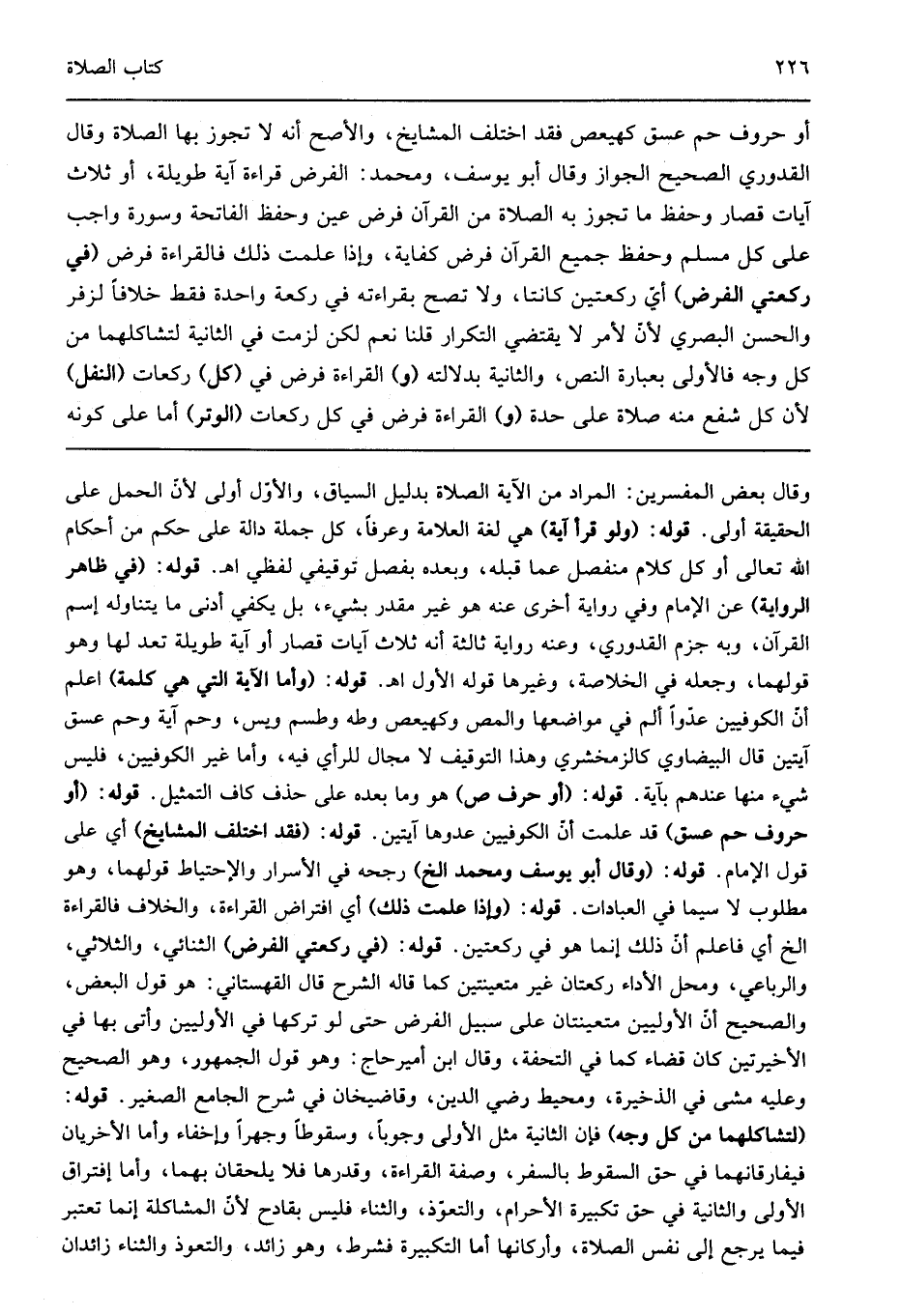 أو حروف حمعسق كهيعص فقد اختلف المشايخ والأصح أنه لا تجوز بها الصلاة وقال القدوري الصحيح الجواز وقال أبو يوسف ومحمد الفرض قراءة آية طويلة أو ثلاث آيات قصار وحفظ ما تجوز به الصلاة من القرآن فرض عين وحفظ الفاتحة وسورة واجب على كل مسلم وحفظ جميع القرآن فرض كفاية وإذا علمت ذلك فالقراءة فرض "في ركعتي فرض" أي ركعتين كانتا ولا تصح بقراءته في ركعة واحدة فقط خلافا لزفر والحسن البصري لأن الأمر لا يقتضي التكرار قلنا نعم لكن لزمت في الثانية لتشاكلهما من كل وجه فالأولى بعبارة النص والثانية بدلالته "و" القراءة فرض في "كل" ركعات "النفل" لأن كل شفع منه صلاة على حدة "و" القراءة فرض في كل ركعات "الوتر" أما كونه
