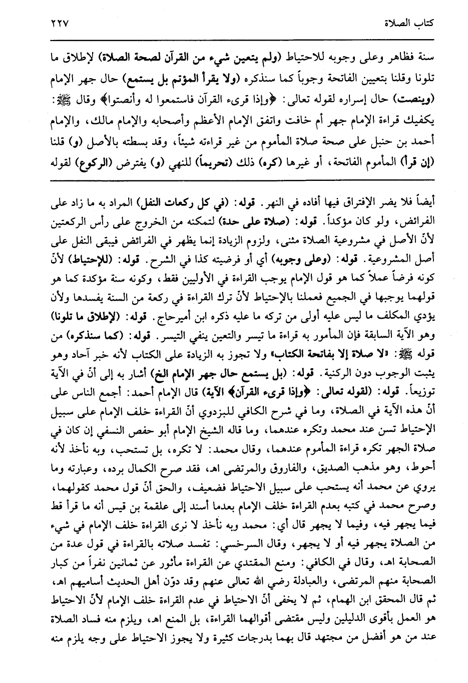 أيضا فلا يضر الإفتراق فيها أفاده في النهر قوله: "في كل ركعات النفل" المراد به ما زاد على الفرائض ولو كان مؤكدا قوله: "صلاة على حدة" لتمكنه من الخروج على رأس الركعتين لأن الأصل في مشروعية الصلاة مثنى ولزوم الزيادة إنما يظهر في الفرائض فيبقى النفل على أصل المشروعية قوله: "وعلى وجوبه" أي أو فرضيته كذا في الشرح قوله: "للإحتياط" لأن كونه فرضا عملا كما هو قول الإمام يوجب القراءة في الأوليين فقط وكونه سنة مؤكدة كما هو قولهما يوجبها في الجميع فعملنا بالإحتياط لأن ترك القراءة في ركعة من السنة يفسدها ولأن يؤدي المكلف ما ليس عليه أولى من تركه ما عليه ذكره ابن أميرحاج قوله: "لإطلاق ما تلونا" وهو الآية السابقة فإن المأمور به قراءة ما تيسر والتعين ينفي التيسر قوله: "كما سنذكره" من قوله صلى الله عليه وسلم: "لا صلاة إلا بفاتحة الكتاب" ولا تجوز به الزيادة على الكتاب لأنه خبر آحاد وهو يثبت الوجوب دون الركنية قوله: "بل يستمع حال جهر الإمام الخ" أشار به إلى أن في الآية توزيعا قوله: لقوله تعالى: {وَإِذَا قُرِئَ الْقُرْآنُ} الآية" قال الإمام أحمد أجمع الناس على أن هذه الآية في الصلاة وما في شرح الكافي للبزدوي أن القراءة خلف الإمام على سبيل الإحتياط تسن عند محمد وتكره عندهما وما قاله الشيخ الإمام أبو حفص النسفي أن كان في صلاة الجهر تكره قراءة المأموم عندهما وقال محمد لا تكره بل تستحب وبه نأخذ لأنه أحوط وهو مذهب الصديق والفاروق والمرتضى اهـ فقد صرح الكمال برده وعبارته وما يروي عن محمد أنه يستحب على سبيل الاحتياط فضعيف والحق أن قول محمد كقولهما وصرح محمد في كتبه بعدم القراءة خلف الإمام بعدما أسند إلى علقمة بن قيس أنه ما قرأ قط فيما يجهر فيه وفيما لا يجهر قال أي محمد وبه نأخذ لا نرى القراءة خلف الإمام في شيء من الصلاة يجهر فيه أو لا يجهر وقال السرخسي تفسد صلاته بالقراءة في قول عدة من الصحابة اهـ وقال في الكافي ومنع المقتدي عن القراءة مأثور عن ثمانين نفرا من كبار الصحابة منهم المرتضى والعبادلة رضي الله تعالى عنهم وقد دون أهل الحديث أساميهم اهـ ثم قال المحقق ابن الهمام ثم لا يخفى أن الاحتياط في عدم القراءة خلف الإمام لأن الاحتياط هو العمل بأقوى الدليلين وليس مقتضى أقواهما القراءة بل المنع اهـ ويلزم منه فساد الصلاة عند من هو أفضل من مجتهد قال بهما بدرجات كثيرة ولا يجوز الاحتياط على وجه يلزم منه