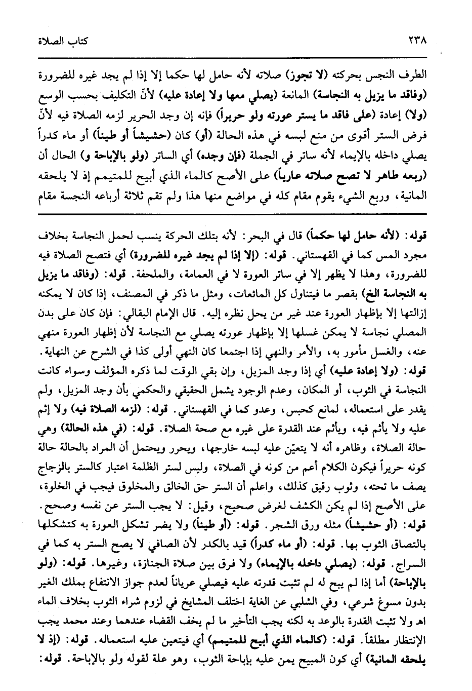 قوله: "لأنه حامل لها حكما" قال في البحر لأنه بتلك الحركة ينسب لحمل النجاسة بخلاف مجرد المس كما في القهستاني قوله: "إلا إذا لم يجد غيره للضرورة" أي فتصح الصلاة فيه للضرورة وهذا لا يظهر إلا في ساتر العورة لا في العمامة والملحفة قوله: "وفاقد ما يزيل به النجاسة الخ" بقصر ما فيتناول كل المائعات ومثل ما ذكر في المصنف إذا كان لا يمكنه إزالتها إلا بإظهار العورة عند غير من يحل نظره إليه قال الإمام البقالي فإن كان على بدن المصلي نجاسة لا يمكن غسلها إلا بإظهار عورته يصلي مع النجاسة لأن إظهار العورة منهي عنه والغسل مأمور به والأمر والنهي إذا اجتمعا كان النهي أولى كذا في الشرح عن النهاية قوله: "ولا إعادة عليه" أي إذا وجد المزيل وإن بقي الوقت لما ذكره المؤلف وسواء كانت النجاسة في الثوب أو المكان وعدم الوجود يشمل الحقيقي والحكمي بأن وجد المزيل ولم يقدر على استعماله لمانع كحبس وعدو كما في القهستاني قوله: "لزمه الصلاة فيه" ولا إثم عليه ولا يأثم فيه ويأثم عند القدرة على غيره مع صحة الصلاة قوله: "في هذه الحالة" وهي حالة الصلاة وظاهره أنه لا يتعين عليه لبسه خارجها ويحرر ويحتمل أن المراد بالحالة حالة كونه حريرا فيكون الكلام أعم من كونه في الصلاة وليس لستر الظلمة اعتبار كالستر بالزجاج يصف ما تحته وثوب رقيق كذلك واعلم أن الستر حق الخالق والمخلوق فيجب في الخلوة على الأصح إذا لم يكن الكشف لغرض صحيح وقيل لا يجب الستر عن نفسه وصحح قوله: "أو حشيشا" مثله ورق الشجر قوله: "أو طينا" ولا يضر تشكل العورة به كتشكلها بالتصاق الثوب بها قوله: "أو ماء كدرا" قيد بالكدر لأن الصافي لا يصح الستر به كما في السراج قوله: "يصلي داخله بالإيماء" ولا فرق بين صلاة الجنازة وغيرها قوله: "ولو بالإباحة" أما إذا لم يبح له لم تثبت قدرته عليه فيصلي عريانا لعدم جواز الانتفاع بملك الغير بدون مسوغ شرعي وفي الشلبي عن الغاية اختلف المشايخ في لزوم شراء الثوب بخلاف الماء اهـ ولا تثبت القدرة بالوعد به لكنه يجب التأخير ما لم يخف القضاء عندهما وعند محمد يجب الإنتظار مطلقا قوله: "كالماء الذي أبيح للمتيمم" أي فيتعين عليه استعماله قوله: "إذ لا يلحقه المانية" أي كون المبيح يمن عليه بإباحة الثوب وهو علة لقوله ولو بالإباحة قوله: