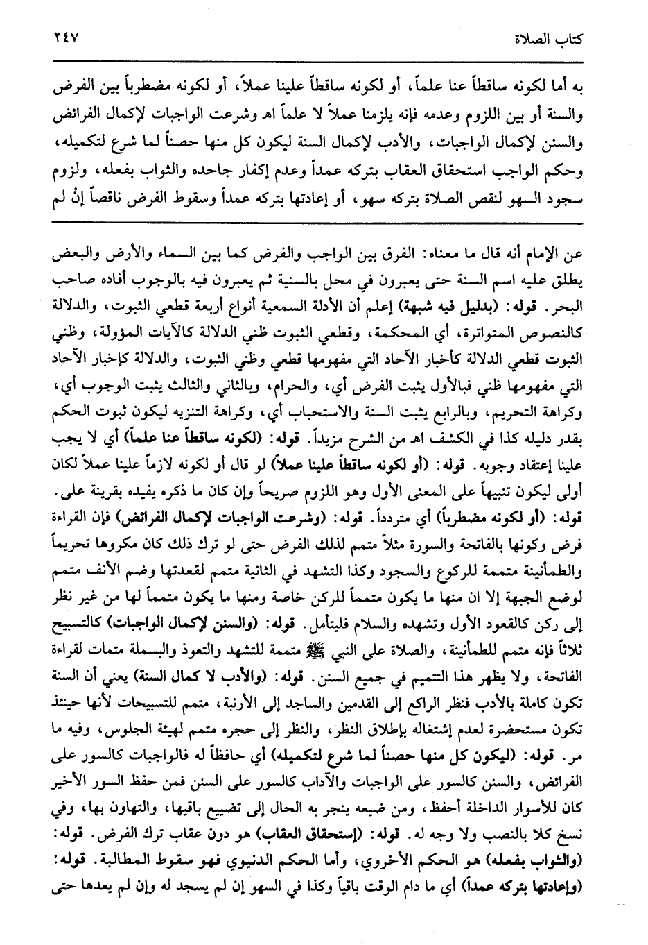عن الإمام انه قال ما معناه الفرق بين الواجب والفرض كما بين السماء والأرض والبعض يطلق عليه اسم السنة حتى يعبرون في محل بالسنية ثم يعبرون فيه بالوجوب أفاده صاحب البحر قوله: "بدليل فيه شبهة" اعلم أن الأدلة السمعية أنواع أربعة قطعي الثبوت والدلالة كالنصوص المتواترة أي المحكمة وقطعي الثبوت ظني الدلالة كالآيات المؤولة وظني الثبوت قطعي الدلالة كإخبار الآحاد التي مفهومها قطعي وظني الثبوت والدلالة كإخبار الآحاد التي مفهومها ظني فبالأول يثبت الفرض أي والحرام وبالثاني والثالث يثبت الوجوب أي وكراهة التحريم وبالرابع يثبت السنة والاستحباب أي وكراهة التنزيه ليكون ثبوت الحكم بقدر دليله كذا في الكشف اهـ من الشرح مزيدا قوله: "لكونه ساقطا عنا علما" أي لا يجب علينا إعتقاد وجوبه قوله: "أو لكونه ساقطا علينا عملا" لو قال أو لكونه لازما علينا عملا لكان أولى ليكون تنبيها على المعنى الأول وهو اللزوم صريحا وإن كان ما ذكره يفيده بقرينة على قوله: "أو لكونه مضطربا" أي مترددا قوله: "وشرعت الواجبات لا كمال الفرائض" فان القراءة فرض وكونها بالفاتحة والسورة مثلا متمم لذلك الفرض حتى لو ترك ذلك كان مكروها تحريما والطمأنينة متممة للركوع والسجود وكذا التشهد في الثانية متمم لقعدتها وضم الأنف متمم لوضع الجبهة إلا ان منها ما يكون متمما للركن خاصة ومنها ما يكون متمما لها من غير نظر إلى ركن كالقعود الأول وتشهده والسلام فليتأمل قوله: "والسنن لا كمال الواجبات" كالتسبيح ثلاثا فإنه متمم للطمأنينة والصلاة على النبي صلى الله عليه وسلم متممة للتشهد والتعوذ والبسملة متمات لقراءة الفاتحة ولا يظهر هذا التتميم في جميع السنن قوله: "والأدب لا كمال السنة" يعني أن السنة تكون كاملة بالأدب فنظر الراكع إلى القدمين والساجد إلى الأرنبة متمم للتسبيحات لأنها حينئذ تكون مستحضرة لعدم إشتغاله بإطلاق النظر والنظر إلى حجره متمم لهيئة الجلوس وفيه ما مر قوله: "ليكون كل منها حصنا لما شرع لتكميله" أي حافظا له فالواجبات كالسور على الفرائض والسنن كالسور على الواجبات والآداب كالسور على السنن فمن حفظ السور الأخير كان للأسوار الداخلة أحفظ ومن ضيعه ينجر به الحال إلى تضييع باقيها والتهاون بها وفي نسخ كلا بالنصب ولا وجه له قوله: "إستحقاق العقاب" هو دون عقاب ترك الفرض قوله: "والثواب بفعله" هو الحكم الأخروي وأما الحكم الدنيوي فهو سقوط المطالبة قوله: "وإعادتها بتركه عمدا" أي ما دام الوقت باقيا وكذا في السهو ان لم يسجد له وإن لم يعدها حتى