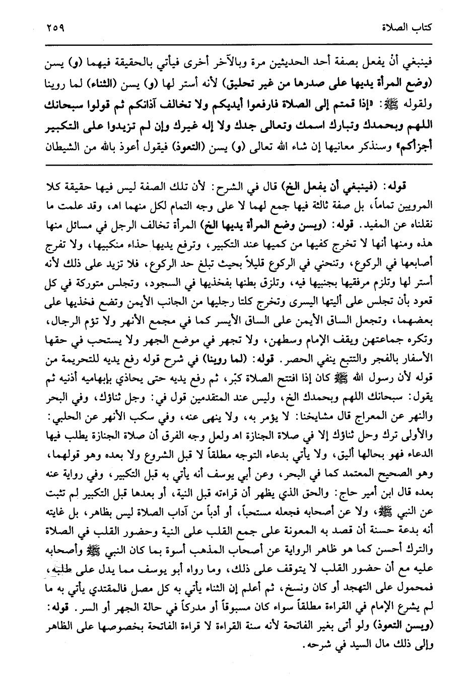 قوله: "فينبغي أن يفعل الخ" قال في الشرح لأن تلك الصفة ليس فيها حقيقة كلا المرويين تماما بل صفة ثالثة فيها جمع لهما لا على وجه التمام لكل منهما اهـ وقد علمت ما نقلناه عن المفيد قوله: "ويسن وضع المرأة يديها الخ" المرأة تخالف الرجل في مسائل منها هذه ومنها أنها لا تخرج كفيها من كميها عند التكبير وترفع يديها حذاء منكبيها ولا تفرج أصابعها في الركوع وتنحني في الركوع قليلا بحيث تبلغ حد الركوع فلا تزيد على ذلك لأنه أستر لها وتلزم مرفقيها بجنبيها فيه وتلزق بطنها بفخذيها في السجود وتجلس متوركة في كل قعود بأن تجلس على أليتها اليسرى وتخرج كلتا رجليها من الجانب الأيمن وتضع فخذيها على بعضهما وتجعل الساق الأيمن على الساق الأيسر كما في مجمع الأنهر ولا تؤم الرجال وتكره جماعتهن ويقف الإمام وسطهن ولا تجهر في موضع الجهر ولا يستحب في حقها الأسفار بالفجر والتتبع ينفي الحصر قوله: "لما روينا" في شرح قوله رفع يديه للتحريمة من قوله لأن رسول الله صلى الله عليه وسلم كان إذا افتتح الصلاة كبر ثم رفع يديه حتى يحاذي بإبهاميه أذنيه ثم يقول سبحانك اللهم وبحمدك الخ وليس عند المتقدمين قول في وجل ثناؤك وفي البحر والنهر عن المعراج قال مشايخنا لا يؤمر به ولا ينهي عنه وفي سكب الأنهر عن الحلبي والأولى ترك وحل ثناؤك إلا في صلاة الجنازة اهـ ولعل وجه الفرق أن صلاة الجنازة يطلب فيها الدعاء فهو بحالها أليق ولا يأتي بدعاء التوجه مطلقا لا قبل الشروع ولا بعده وهو قولهما وهو الصحيح المعتمد كما في البحر وعن أبي يوسف أنه يأتي به قبل التكبير وفي رواية عنه بعده قال ابن أمير حاج والحق الذي يظهر أن قراءته قبل النية أو بعدها قبل التكبير لم تثبت عن النبي صلى الله عليه وسلم ولا عن أصحابه فجعله مستحبا أو أدبا من آداب الصلاة ليس بظاهر بل غايته أنه بدعة حسنة أن قصد به المعونة على جمع القلب على النية وحضور القلب في الصلاة والترك أحسن كما هو ظاهر الرواية عن أصحاب المذهب أسوة بما كان النبي صلى الله عليه وسلم وأصحابه عليه مع أن حضور القلب لا يتوقف على ذلك وما رواه أبو يوسف مما يدل على طلبه فمحمول على التهجد أو كان ونسخ ثم أعلم إن الثناء يأتي به كل مصل فالمفتدي يأتي به ما لم يشرع الإمام في القراءة مطلقا سواء كان مسبوقا أو مدركا في حالة الجهر أو السر قوله: "ويسن التعوذ" ولو أتى بغير الفاتحة لأنه سنة القراءة لا قراءة الفاتحة بخصوصها على الظاهر وإلى ذلك مال السيد في شرحه.