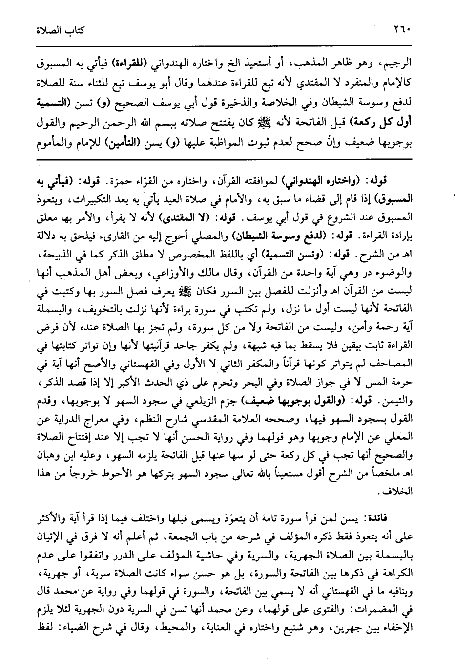 قوله: "واختاره الهندواني" لموافقته القرآن واختاره من القراء حمزة قوله: "فيأتي به المسبوق" إذا قام إلى قضاء ما سبق به والأمام في صلاة العيد يأتي به بعد التكبيرات ويتعوذ المسبوق عند الشروع في قول أبي يوسف قوله: "لا المقتدى" لأنه لا يقرأ والأمر بها معلق بإرادة القراءة قوله: "لدفع وسوسة الشيطان" والمصلي أحوج إليه من القارىء فيلحق به دلالة اهـ من الشرح قوله: "وتسن التسمية" أي باللفظ المخصوص لا مطلق الذكر كما في الذبيحة والوضوء در وهي آية واحدة من القرآن وقال مالك والأوزاعي وبعض أهل المذهب أنها ليست من القرآن اهـ وأنزلت للفصل بين السور فكان صلى الله عليه وسلم يعرف فصل السور بها وكتبت في الفاتحة لأنها ليست أول ما نزل ولم تكتب في سورة براءة لأنها نزلت بالتخويف والبسملة آية رحمة وأمن وليست من الفاتحة ولا من كل سورة ولم تجز بها الصلاة عنده لأن فرض القراءة ثابت بيقين فلا يسقط بما فيه شبهة ولم يكفر جاحد قرآنيتها لأنها وإن تواتر كتابتها في المصاحف لم يتواتر كونها قرآنا والمكفر الثاني لا الأول وفي القهستاني والأصح أنها آية في حرمة المس لا في جواز الصلاة وفي البحر وتحرم على ذي الحدث الأكبر إلا إذا قصد الذكر والتيمن قوله: "والقول بوجوبها ضعيف" جزم الزيلعي في سجود السهو لا بوجوبها وقدم القول بسجود السهو فيها وصححه العلامة المقدسي شارح النظم وفي معراج الدراية عن المعلي عن الإمام وجوبها وهو قولهما وفي رواية الحسن أنها لا تجب إلا عند إفتتاح الصلاة والصحيح أنها تجب في كل ركعة حتى لو سها عنها قبل الفاتحة يلزمه السهو وعليه ابن وهبان اهـ ملخصا من الشرح أقول مستعينا بالله تعالى سجود السهو بتركها هو الأحوط خروجا من هذا الخلاف.