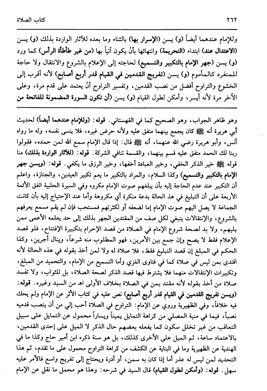 وهو ظاهر الجواب وهو الصحيح كما في القهستاني قوله: "وللإمام عندهما أيضا" لحديث أبي هريرة أنه صلى الله عليه وسلم كان يجمع بينهما متفق عليه ولأنه حرض غيره فلا ينسى نفسه وله ما رواه أنس وأبو هريرة رضي الله عنهما أنه صلى الله عليه وسلم قال: "إذا قال الإمام سمع الله لمن حمده فقولوا ربنا لك الحمد" متفق عليه قسم بينهما والقسمة تنافي الشركة قوله: "للآثار الواردة بذلك" منا قوله صلى الله عليه وسلم: "خير الذكر الخفي وخير العبادة أخفها وخير الرزق ما يكفي" قوله: "ويسن جهر الإمام بالتكبير والتسميع" وكذا السلام والمراد بالتكبير ما يعم تكبير العيدين والجنازة واعلم أن التكبير عند عدم الحاجة إليه بأن يبلغهم صوت الإمام مكروه وفي السيرة الحلبية اتفق الأئمة الأربعة على أن التبليغ في هذ الحالة بدعة منكرة أي مكروهة وأما عند الإحتياج إليه بأن كانت الجماعة لا يصل اليهم صوت الإمام إما لضعفه أو لكثرتهم فمستحب فإن لم يقم مسمع يعرفهم بالشروع والإنتقالات ينبغي لكل صف من المقتدين الجهر بذلك إلى حد يعلمه الأعمى ممن يليهم ولا بد لصحة شروع الإمام في الصلاة من قصد الإحرام بتكبيرة الإفتتاح فلو قصد الإعلام فقط لا يصح وإن جمع بين الأمرين فهو المطلوب منه شرعا وينال أجرين وكذا الحكم في المبلغ إن قصد التبليغ فقط فلا صلاة له ولا لمن أخذ بقوله في هذه الحالة لأنه اقتدى بمن ليس في صلاة كما في فتاوى الغزي وأما التسميع من الإمام والتحميد من المبلغ وتكبيرات الإنتقالات منهما فلا يشترط فيها قصد الذكر لصحة الصلاة بل للثواب ولا تفسد صلاة من أخذ بقوله لأنه مقتد بمن في الصلاة بخلاف الأولى اهـ من السيد وغيره قوله: "ويسن تفريج القدمين في القيام قدر أربع أصابع" نص عليه في كتاب الأثر عن الإمام ولم يحك فيه خلافا وفي الظهيرية وروى عن الإمام التراوح في الصلاة أحب إلي من أن ينصب قدميه نصبا فيما في منية المصلي من كراهة التمايل يمينا ويسارا محمول عن التمايل على سبيل التعاقب من غير تخلل سكون كما يفعله بعضهم حال الذكر لا الميل على إحدى القدمين بالاعتماد ساعة ثم الميل على الأخرى كذلك بل هو سنة ذكره ابن أمير حاج وكذا ما في الهندية عن الظهيرية وما في البناية عن الكشف من كراهة التراوح محمول على ما تقدم ثم هذا التحديد لمن ليس له عذر أما إذا كان به سمن أو أدرة ويحتاج إلى تفريج واسع فالأمر عليه سهل قوله: "وأمكن لطول القيام" قال السيد في شرحه وهذا هو محمل ما نقل عن الإمام