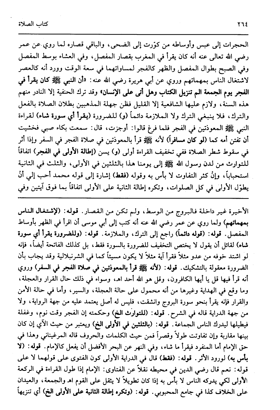 الحجرات إلى عبس وأوساطه من كورت إلى الضحى والباقي قصاره لما روي عن عمر رضي الله تعالى عنه أنه كان يقرأ في المغرب بقصار المفصل وفي العشاء بوسط المفصل وفي الصبح بطوال المفصل والظهر كالفجر لمساواتهما في سعة الوقت وورد انه كالعصر لاشتغال الناس بمهماتهم وروي عن أبي هريرة رضي الله عنه أن النبي صلى الله عليه وسلم كان يقرأ في الفجر يوم الجمعة "ألم تنزيل الكتاب" و "هل أتى على الإنسان" وقد ترك الحنفية إلا النادر منهم هذه السنة ولازم عليها الشافعية إلا القليل. فظن جهلة المذهبين بطلان الصلاة بالفعل والترك فلا ينبغي الترك ولا الملازمة دائما "و" للضرورة "يقرأ أي سورة شاء" لقراءة النبي صلى الله عليه وسلم المعوذتين في الفجر. فلما فرغ قالوا: أوجزت قال سمعت بكاء صبي فخشيت أن تفتن أمه كما لو كان مسافرا لأنه صلى الله عليه وسلم قرأ بالمعوذتين في صلاة الفجر في السفر وإذا كثر في سقوط شطر الصلاة ففي تخفيف القراءة أولى "و" يسن "إطالة الأولى في الفجر" اتفاقا للتوارث من لدن رسول الله صلى الله عليه وسلم إلى يومنا هذا بالثلثين في الأولى والثلث في الثانية استحبابا وإن كثر التفاوت لا بأس به وقوله "فقط" إشارة إلى قول محمد أحب إلي أن يطول الأولى في كل الصلوات وتكره إطالة الثانية على الأولى اتفاقا بما فوق آيتين وفي