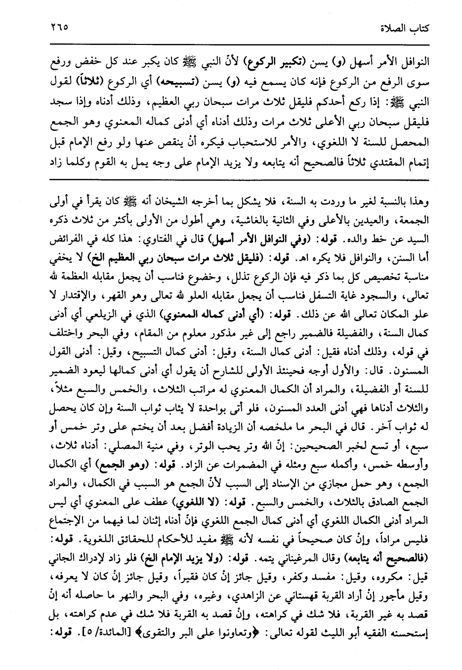 وهذا بالنسبة لغير ما وردت به السنة فلا يشكل بما أخرجه الشيخان أنه صلى الله عليه وسلم كان يقرأ في أولى الجمعة والعيدين بالأعلى وفي الثانية بالغاشية وهي أطول من الأولى بأكثر من ثلاث ذكره السيد عن خط والده قوله: "وفي النوافل الأمر أسهل" قال في الفتاوى هذا كله في الفرائض أما السنن والنوافل فلا يكره اهـ قوله: "فليقل ثلاث مرات سبحان ربي العظيم الخ" لا يخفي مناسبة تخصيص كل بما ذكر فيه فإن الركوع تذلل وخضوع فناسب أن يجعل مقابله العظمة لله تعالى والسجود غاية التسفل فناسب أن يجعل مقابله العلو لله تعالى وهو القهر والإقتدار لا علو المكان تعالى الله عن ذلك قوله: "أي أدنى كماله المعنوي" الذي في الزيلعي أي أدنى كمال السنة والفضيلة فالضمير راجع إلى غير مذكور معلوم من المقام وفي البحر واختلف في قوله وذلك أدناه فقيل أدنى كمال السنة وقيل أدنى كمال التسبيح وقيل أدنى القول المسنون قال والأول أوجه فحينئذ الأولى للشارح أن يقول أي أدنى كمالها ليعود الضمير للسنة أو الفضيلة والمراد أن الكمال المعنوي له مراتب الثلاث والخمس والسبع مثلا والثلاث أدناها فهي أدنى العدد المسنون فلو أتى بواحدة لا يثاب ثواب السنة وإن كان يحصل له ثواب آخر قال في البحر ما ملخصه ان الزيادة أفضل بعد أن يختم على وتر خمس أو سبع أو تسع لخبر الصحيحين إن الله وتر يحب الوتر وفي منية المصلي أدناه ثلاث وأوسطه خمس وأكمله سبع ومثله في المضمرات عن الزاد قوله: "وهو الجمع" أي الكمال الجمع وهو حمل مجازي من الإسناد إلى السبب لأن الجمع هو السبب في الكمال والمراد الجمع الصادق بالثلاث والخمس والسبع قوله: "لا اللغوي" عطف على المعنوي أي ليس المراد أدنى الكمال اللغوي أي أدنى كمال الجمع اللغوي فإن أدناه إثنان لما فيهما من الإجتماع فليس مرادا وإن كان صحيحا في نفسه لأنه صلى الله عليه وسلم مفيد للأحكام للحقائق اللغوية قوله: "فالصحيح أنه يتابعه" وقال المرغيناني يتمه قوله: "ولا يزيد الإمام الخ" فلو زاد لإدراك الجاني قيل مكروه وقيل مفسد وكفر وقيل جائز إن كان فقيرا وقيل جائز إن كان لا يعرفه وقيل مأجور إن أراد القربة قهستاني عن الزاهدي وغيره وفي البحر والنهر ما حاصله أنه إن قصد به غير القربة فلا شك في كراهته وإن قصد به القربة فلا شك في عدم كراهته بل إستحسنه الفقيه أبو الليث لقوله تعالى: {وَتَعَاوَنُوا عَلَى الْبِرِّ وَالتَّقْوَى} [المائدة 2] قوله:.