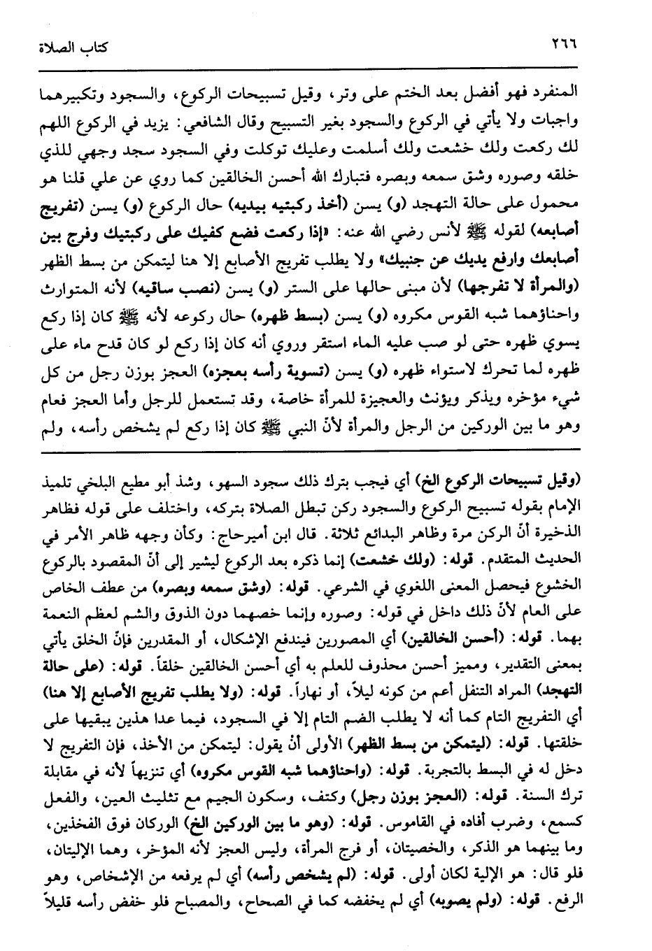 المنفرد فهو أفضل بعد الختم على وتر وقيل تسبيحات الركوع والسجود وتكبيرهما واجبات ولا يأتي في الركوع أو السجود بغير التسبيح وقال الشافعي يزيد في الركوع اللهم لك ركعت ولك خشعت ولك أسلمت وعليك توكلت. وفي السجود سجد وجهي للذي خلقه وصوره وشق سمعه وبصره فتبارك الله أحسن الخالقين. كما روي عن علي قلنا هو محمول على حالة التهجد "و" يسن "أخذ ركبتيه بيديه" حال الركوع "و" يسن "تفريج أصابعه" لقوله صلى الله عليه وسلم لأنس رضي الله عنه "إذا ركعت فضع كفيك على ركبتيك وفرج بين أصابعك وارفع يديك عن جنبيك" ولا يطلب تفريج الأصابع إلا هنا ليتمكن من بسط الظهر "والمرأة لا تفرجها" لأن مبنى حالها على الستر "و" يسن "نصب ساقيه" لأنه المتوارث وإحناؤهما شبه القوس مكروه "و" يسن "بسط ظهره" حال ركوعه لأنه صلى الله عليه وسلم كان إذا ركع يسوي ظهره حتى لو صب عليه الماء استقر وروي أنه كان إذا ركع لو كان قدح ماء على ظهره لما تحرك لاستواء ظهره "و" يسن "تسوية رأسه بعجزه" العجز بوزن رجل من كل شيء مؤخره ويذكر ويؤنث والعجيزة للمرأة خاصة وقد تستعمل للرجل وأما العجز فعام وهو ما بين الوركين من الرجل والمرأة لأن النبي صلى الله عليه وسلم كان إذا ركع لم يشخص رأسه ولم