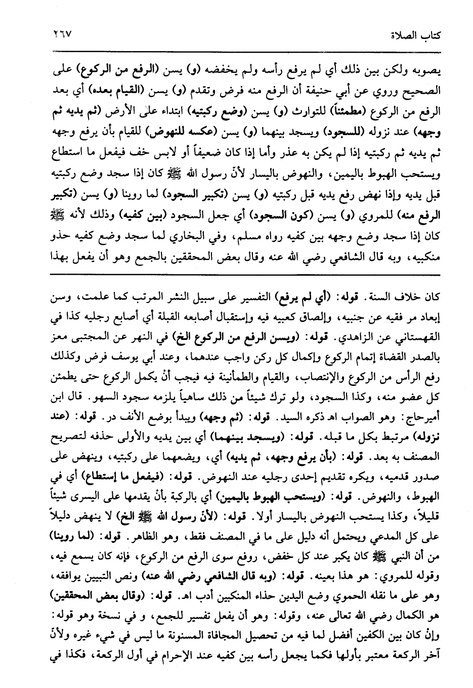 يصوبه ولكن بين ذلك أي لم يرفع رأسه ولم يخفضه "و" يسن "الرفع من الركوع" على الصحيح وروي عن أبي حنيفة أن الرفع منه فرض وتقدم "و" يسن "القيام بعده" أي بعد الرفع من الركوع "مطمئنا" للتوارث "و" يسن "وضع ركبتيه" ابتداء على الأرض "ثم يديه ثم وجهه" عند نزوله "للسجود" ويسجد بينهما "و" يسن "عكسه للنهوض" للقيام بأن يرفع وجهه ثم يديه ثم ركبتيه إذا لم يكن به عذر وأما إذا كان ضعيفا أو لابس خف فيفعل ما استطاع ويستحب الهبوط باليمين والنهوض باليسار لأن رسول الله صلى الله عليه وسلم كان إذا سجد وضع ركبتيه قبل يديه وإذا نهض رفع يديه قبل ركبتيه "و" يسن "تكبير السجود" لما روينا "و" يسن "تكبير الرفع" منه للمروي "و" يسن "كون السجود" أي جعل السجود "بين كفيه" وذلك لأنه صلى الله عليه وسلم كان إذا سجد وضع وجهه بين كفيه رواه مسلم وفي البخاري لما سجد وضع كفيه حذو منكبيه وبه قال الشافعي رحمه الله وقال بعض المحققين بالجمع وهو أن يفعل بهذا.