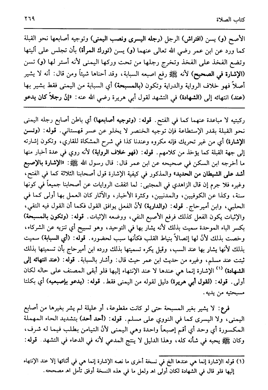 ركبتيه لا مباعدة عنهما كما في الفتح قوله: "وتوجيه أصابعها" أي باطن أصابع رجله اليمنى نحو القبلة بقدر الإستطاعة فإن توجيه الخنصر لا يخلو عن عسر قهستاني قوله: "وتسن الإشارة" أي من غير تحريك فإنه مكروه وعندنا كذا في شرح المشكاة للقاري وتكون إشارته إلى جهة القبلة كما يؤخذ من كلامهم قوله: "فهو خلاف الرواية" لأنه روي في عدة أخبار منها ما أخرجه ابن السكن في صحيحه عن ابن عمر قال قال رسول الله صلى الله عليه وسلم "الإشارة بالإصبع أشد على الشيطان من الحديد" والمذكور في كيفية الإشارة قول أصحابنا الثلاثة كما في الفتح وغيره فلا جرم إن قال الزاهدي في المجتبى لما اتفقت الروايات عن أصحابنا جميعا في كونها سنة وكذا عن الكوفيين والمدني وكثرة الأخبار والآثار كان العمل بها أولى كما في الحلبي وابن أميرحاج قوله: "والدارية" لأن الفعل يوافق القول فكما أن القول فيه التقي والإثبات يكون الفعل كذلك فرفع الأصبع النفي ووضعه الإثبات قوله: "وتكون بالمسبحة" بكسر الباء الموحدة سميت بذلك لأنه يشار بها في التوحيد وهو تسبيح أي تنزيه عن الشركاء وخصت بذلك لأن لها إتصالا بنياط القلب فكأنها سبب لحضوره قوله: "أي السبابة" سميت بذلك لأنها يشار بها عند السب وقيل يكره تسميتها بذلك ورده ابن أميرحاج بأن تسميتها بذلك ثبتت عند مسلم وغيره من حديث ابن عمر حيث قال وأشار بالسبابة قوله: "عند انتهائه إلى الشهادة" 1 الإشارة إنما هي عندها لا عند الإنتهاء إليها فلو أبقى المصنف على حاله لكان أولى قوله: "لقول أبي هريرة" دليل لقوله من اليمنى فقط قوله: "يدعو بإصبعيه" أي بكلتا مسبحتيه من يديه.