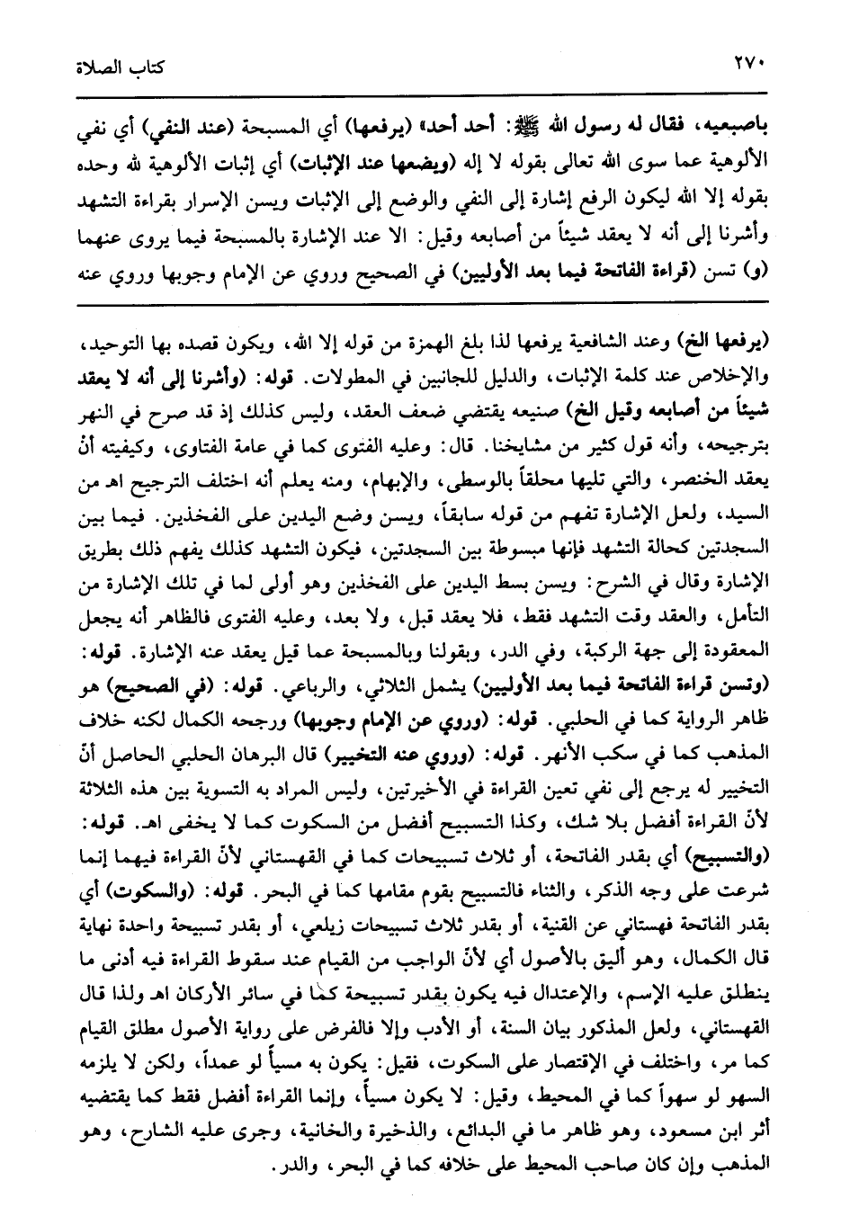 "يرفعها الخ" وعند الشافعية يرفعها لذا بلغ الهمزة من قوله إلا الله ويكون قصده بها التوحيد والإخلاص عند كلمة الإثبات والدليل للجانبين في المطولات قوله: "وأشرنا إلى أنه لا يعقد شيئا من أصابعه وقيل الخ" صنيعه يقتضي ضعف العقد وليس كذلك إذ قد صرح في النهر بترجيحه وأنه قول كثير من مشايخنا قال وعليه الفتوى كما في عامة الفتاوى وكيفيته أن يعقد الخنصر والتي تليها محلقا بالوسطى والإبهام ومنه يعلم أنه اختلف الترجيح اهـ من السيد ولعل الإشارة تفهم من قوله سابقا ويسن وضع اليدين على الفخذين فيما بين السجدتين كحالة التشهد فإنها مبسوطة بين السجدتين فيكون التشهد كذلك يفهم ذلك بطريق الإشارة وقال في الشرح ويسن بسط اليدين على الفخذين وهو أولى لما في تلك الإشارة من التأمل والعقد وقت التشهد فقط فلا يعقد قبل ولا بعد وعليه الفتوى فالظاهر أنه يجعل المعقودة إلى جهة الركبة وفي الدر وبقولنا وبالمسبحة عما قيل يعقد عنه الإشارة قوله: "وتسن قراءة الفاتحة فيما بعد الأوليين" يشمل الثلاثي والرباعي قوله: "في الصحيح" هو ظاهر الرواية كما في الحلبي قوله: "وروي عن الإمام وجوبها" ورجحه الكمال لكنه خلاف المذهب كما في سكب الأنهر قوله: "وروي عنه التخيير" قال البرهان الحلبي الحاصل أن التخيير له يرجع إلى نفي تعين القراءة في الأخيرتين وليس المراد به التسوية بين هذه الثلاثة لأن القراءة أفضل بلا شك وكذا التسبيح أفضل من السكوت كما لا يخفى اهـ قوله: "والتسبيح" أي بقدر الفاتحة أو ثلاث تسبيحات كما في القهستاني لأن القراءة فيهما إنما شرعت على وجه الذكر والثناء فالتسبيح بقوم مقامها كما في البحر قوله: "والسكوت" أي بقدر الفاتحة قهستاني عن القنية أو بقدر ثلاث تسبيحات زيلعي أو بقدر تسبيحة واحدة نهاية قال الكمال وهو أليق بالأصول أي لأن الواجب من القيام عند سقوط القراءة فيه أدنى ما ينطلق عليه الإسم والإعتدال فيه يكون بقدر تسبيحة كما في سائر الأركان اهـ ولذا قال القهستاني ولعل المذكور بيان السنة أو الأدب وإلا فالفرض على رواية الأصول مطلق القيام كما مر واختلف في الإقتصار على السكوت فقيل يكون به مسيأ لو عمدا ولكن لا يلزمه السهو لو سهوا كما في المحيط وقيل لا يكون مسيأ وإنما القراءة أفضل فقط كما يقتضيه أثر ابن مسعود وهو ظاهر ما في البدائع والذخيرة والخانية وجرى عليه الشارح وهو المذهب وإن كان صاحب المحيط على خلافه كما في البحر والدر.