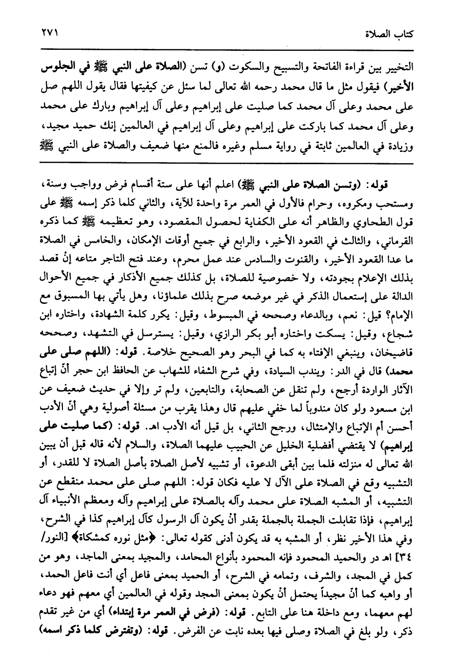 قوله: "وتسن الصلاة على النبي صلى الله عليه وسلم" اعلم أنها على ستة أقسام فرض وواجب وسنة ومستحب ومكروه وحرام فالأول في العمر مرة واحدة للآية والثاني كلما ذكر إسمه صلى الله عليه وسلم على قول الطحاوي والظاهر أنه على الكفاية لحصول المقصود وهو تعظيمه صلى الله عليه وسلم كما ذكره القرماني والثالث في القعود الأخير والرابع في جميع أوقات الإمكان والخامس في الصلاة ما عدا القعود الأخير والقنوت والسادس عند عمل محرم وعند فتح التاجر متاعه إن قصد بذلك الإعلام بجودته ولا خصوصية للصلاة بل كذلك جميع الأذكار في جميع الأحوال الدالة على إستعمال الذكر في غير موضعه صرح بذلك علماؤنا وهل يأتي بها المسبوق مع الإمام قيل نعم وبالدعاء وصححه في المبسوط وقيل يكرر كلمة الشهادة واختاره ابن شجاع وقيل يسكت واختاره أبو بكر الرازي وقيل يسترسل في التشهد وصححه قاضيخان وينبغي الإفتاء به كما في البحر وهو الصحيح خلاصة قوله: "اللهم صلي على محمد" قال في الدر ويندب السيادة وفي شرح الشفاء للشهاب عن الحافظ ابن حجر أن إتباع الآثار الواردة أرجح ولم تنقل عن الصحابة والتابعين ولم تر وإلا في حديث ضعيف عن ابن مسعود ولو كان مندوبا لما خفي عليهم قال وهذا يقرب من مسألة أصولية وهي أن الأدب أحسن أم الإتباع والإمتثال ورجح الثاني بل قيل أنه الأدب اهـ قوله: "كما صليت على إبراهيم" لا يقتضي أفضلية الخليل عن الحبيب عليهما الصلاة والسلام لأنه قاله قبل أن يبين الله تعالى له منزلته فلما بين أبقى الدعوة أو تشبيه لأصل الصلاة بأصل الصلاة لا للقدر أو التشبيه وقع في الصلاة على الآل لا عليه فكان قوله اللهم صلى على محمد منقطع عن التشبيه أو المشبه الصلاة على محمد وآله بالصلاة على إبراهيم وآله ومعظم الأنبياء آل إبراهيم فإذا تقابلت الجملة بالجملة بقدر أن يكون آل الرسول كآل إبراهيم كذا في الشرح وفي هذا الأخير نظر أو المشبه به قد يكون أدنى كقوله تعالى: {مَثَلُ نُورِهِ كَمِشْكَاةٍ} [النور 35] اهـ در والحميد المحمود فإنه المحمود بأنواع المحامد والمجيد بمعنى الماجد وهو من كمل في المجد والشرف وتمامه في الشرح أو الحميد بمعنى فاعل أي أنت فاعل الحمد أو واهبه كما أن مجيدا يحتمل أن يكون بمعنى المجد وقوله في العالمين أي معهم فهو دعاء لهم معهما ومع داخلة هنا على التابع قوله: "فرض في العمر مرة إبتداء" أي من غير تقدم ذكر ولو بلغ في الصلاة وصلى فيها بعده نابت عن الفرض قوله: "وتفترض كلما ذكر اسمه"