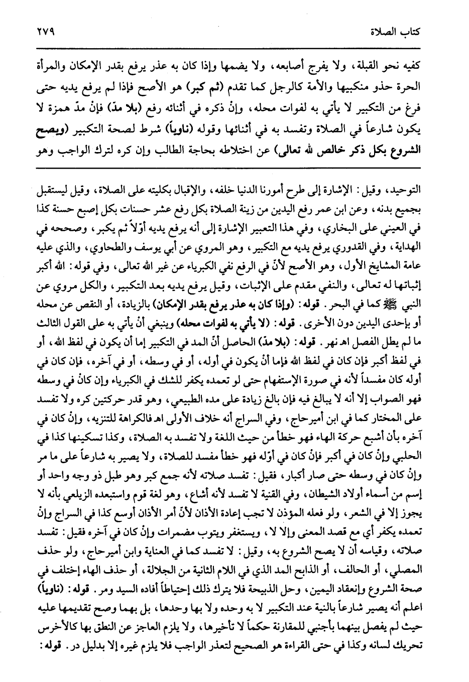 كفيه نحو القبلة ولا يفرج أصابعه ولا يضمها وإذا كان به عذر يرفع بقدر الإمكان. والمرأة الحرة حذو منكبيها والأمة كالرجل كما تقدم "ثم كبر" هو الأصح فإذا لم يرفع يديه حتى فرغ من التكبير لا يأتي به لفوات محله وإن ذكره في أثنائه رفع "بلا مد" فإن مد همزه لا يكون شارعا في الصلاة وتفسد به في أثنائها وقوله "ناويا" شرط لصحة التكبير "ويصح الشروع بكل ذكر خالص لله تعالى" عن اختلاطه بحاجة الطالب وإن كره لترك الواجب وهو