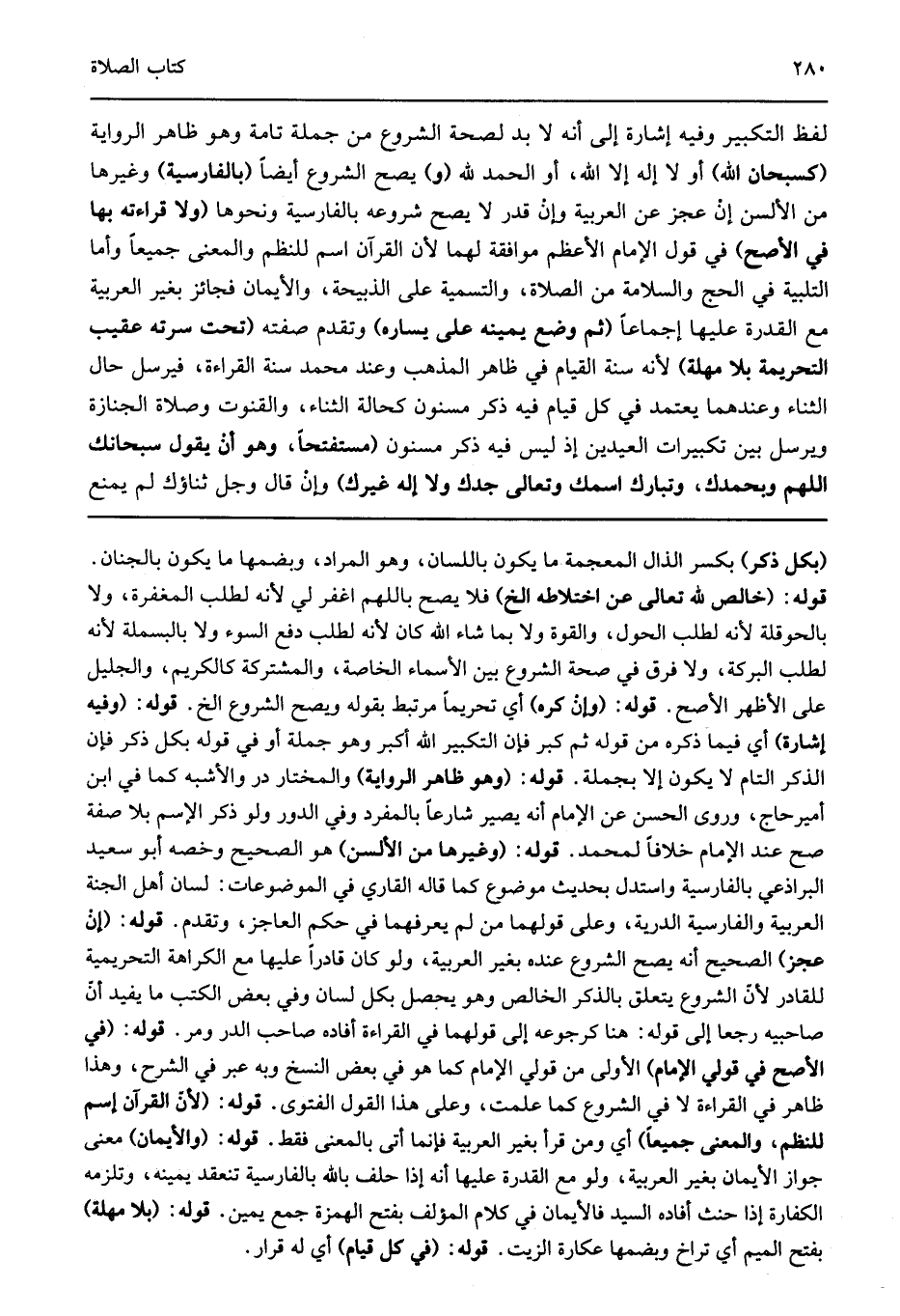 "بكل ذكر" بكسر الذال المعجمة ما يكون باللسان وهو المراد وبضمها ما يكون بالجنان قوله: "خالص لله تعالى عن اختلاطه الخ" فلا يصح باللهم اغفر لي لأنه لطلب المغفرة ولا بالحوقلة لأنه لطلب الحول والقوة ولا بما شاء الله كان لأنه لطلب دفع السوء ولا بالبسملة لأنه لطلب البركة ولا فرق في صحة الشروع بين الأسماء الخاصة والمشتركة كالكريم والجليل على الأظهر الأصح قوله: "وإن كره" أي تحريما مرتبط بقوله ويصح الشروع الخ قوله: "وفيه إشارة" أي فيما ذكره من قوله ثم كبر فإن التكبير الله أكبر وهو جملة أو في قوله بكل ذكر فإن الذكر التام لا يكون إلا بجملة قوله: "وهو ظاهر الرواية" والمختار در والأشبه كما في ابن أميرحاج وروى الحسن عن الإمام أنه يصير شارعا بالمفرد وفي الدور ولو ذكر الإسم بلا صفة صح عند الإمام خلافا لمحمد قوله: "وغيرها من الألسن" هو الصحيح وخصه أبو سعيد البراذعي بالفارسية واستدل بحديث موضوع كما قاله القاري في الموضوعات لسان أهل الجنة العربية والفارسية الدرية وعلى قولهما من لم يعرفهما في حكم العاجز وتقدم قوله: "إن عجز" الصحيح أنه يصح الشروع عنده بغير العربية ولو كان قادرا عليها مع الكراهة التحريمية للقادر لأن الشروع يتعلق بالذكر الخالص وهو يحصل بكل لسان وفي بعض الكتب ما يفيد أن صاحبيه رجعا إلى قوله هنا كرجوعه إلى قولهما في القراءة أفاده صاحب الدر ومر قوله: "في الأصح في قولي الإمام" الأولى من قولي الإمام كما هو في بعض النسخ وبه عبر في الشرح وهذا ظاهر في القراءة لا في الشروع كما علمت وعلى هذا القول الفتوى قوله: "لأن القرآن إسم للنظم والمعنى جميعا" أي ومن قرأ بغير العربية فإنما أتى بالمعنى فقط قوله: "والأيمان" معنى جواز الأيمان بغير العربية ولو مع القدرة عليها أنه إذا حلف بالله بالفارسية تنعقد يمينه وتلزمه الكفارة إذا حنث أفاده السيد فالأيمان في كلام المؤلف بفتح الهمزة جمع يمين قوله: "بلا مهلة" بفتح الميم أي تراخ وبضمها عكارة الزيت قوله: "في كل قيام" أي له قرار.