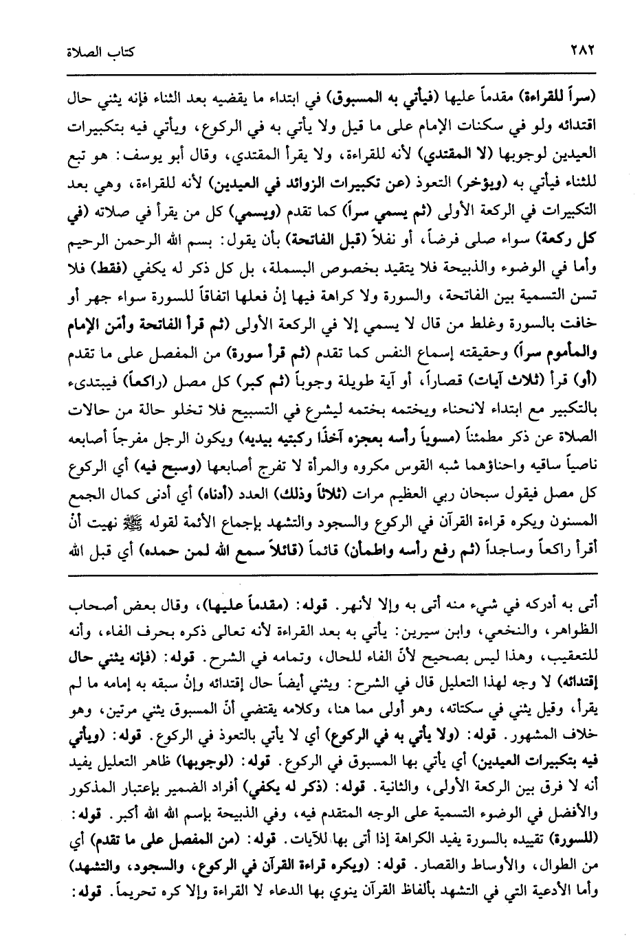 أتى به أدركه في شيء منه أتى به وإلا لأنهر قوله: "مقدما عليها" وقال بعض أصحاب الظواهر والنخعي وابن سيرين يأتي به بعد القراءة لأنه تعالى ذكره بحرف الفاء وأنه للتعقيب وهذا ليس بصحيح لأن الفاء للحال وتمامه في الشرح قوله: "فإنه يثني حال إقتدائه" لا وجه لهذا التعليل قال في الشرح ويثني أيضا حال إقتدائه وإن سبقه به إمامه ما لم يقرأ وقيل يثني في سكتاته وهو أولى مما هنا وكلامه يقتضي أن المسبوق يثني مرتين وهو خلاف المشهور قوله: "ولا يأتي به في الركوع" أي لا يأتي بالتعوذ في الركوع قوله: "ويأتي فيه بتكبيرات العيدين" أي يأتي بها المسبوق في الركوع قوله: "لوجوبها" ظاهر التعليل يفيد أنه لا فرق بين الركعة الأولى والثانية قوله: "ذكر له يكفي" أفراد الضمير بإعتبار المذكور والأفضل في الوضوء التسمية على الوجه المتقدم فيه وفي الذبيحة بإسم الله الله أكبر قوله: "للسورة" تقييده بالسورة يفيد الكراهة إذا أتى بها للآيات قوله: "من المفصل على ما تقدم" أي من الطوال والأوساط والقصار قوله: "ويكره قراءة القرآن في الركوع والسجود والتشهد" وأما الأدعية التي في التشهد بألفاظ القرآن ينوي بها الدعاء لا القراءة وإلا كره تحريما قوله: