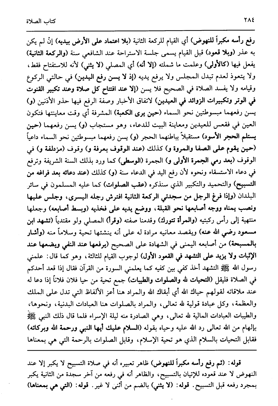رفع رأسه مكبرا للنهوض" أي القيام بالركعة الثانية "بلا اعتماد على الأرض بيديه" إن لم يكن به عذر "وبلا قعود" قبل القيام يسمى جلسة الاستراحة عند الشافعي سنة "والركعة الثانية" يفعل فيها "كالأولى" وعلمت ما شملته "إلا أنه" أي المصلي "لا يثني" لأنه للافتتاح فقط "ولا يتعوذ" لعدم تبدل المجلس "و" لا يرفع يديه إذ "لا يسن رفع اليدين" في حالتي الركوع وقيامه ولا يفسد الصلاة في الصحيح فلا يسن "إلا عند افتتاح كل صلاة وعند تكبير القنوت في الوتر وتكبيرات الزوائد في العيدين" لاتفاق الأخبار وصفة الرفع فيها حذو الأذنين "و" يسن رفعهما مبسوطتين نحو السماء "حين يرى الكعبة" المشرفة أي وقت معاينتها فتكون العين في فقعس للعيدين ومعاينة البيت للدعاء وهو مستجاب "و" يسن رفعهما "حين يستلم الحجر الأسود" مستقبلا بباطنهما الحجر "و" يسن رفعهما مبسوطتين نحو السماء داعيا "حين يقوم على الصفا والمروة و" كذلك "عند الوقوف بعرفة و" وقوف "مزدلفة و" في الوقوف "بعد رمي الجمرة الأولى و" الجمرة "الوسطى" كما ورد بذلك السنة الشريفة وترفع في دعاء الاستسقاء ونحوه لأن رفع اليد في الدعاء سنة "و" كذلك "عند" دعائه بعد فراغه من "التسبيح" والتحميد والتكبير الذي سنذكره "عقب الصلوات" كما عليه المسلمون في سائر البلدان "وإذا فرغ" الرجل من سجدتي الركعة الثانية افترش رجله اليسرى وجلس عليها ونصب يمناه ووجه أصابعها نحو القبلة ووضع يديه على فخذيه وبسط أصابعه وجعلها منتهية إلى رأس ركبتيه "والمرأة تتورك" وقدمنا صفته "وقرأ" المصلي ولو مقتديا "تشهد ابن مسعود رضي الله عنه" ويقصد معانيه مرادة له على أنه ينشئها تحية وسلاما منه "وأشار بالمسبحة" من أصابعه اليمنى "في الشهادة" على الصحيح "يرفعها عند النفي ويضعها عند الإثبات ولا يزيد على التشهد في القعود الأول" لوجوب القيام للثالثة "وهو" كما قال علمني رسول الله صلى الله عليه وسلم التشهد أخذ كفي بين كفيه كما يعلمني السورة من القرآن فقال: "إذا قعد أحدكم في الصلاة فليقل "التحيات لله والصلوات والطيبات" جمع تحية من حيا فلان فلانا إذا دعا له عند ملاقاته كقولهم حياك الله أي أبقاك والمراد هنا أعز الألفاظ التي تدل على الملك والعظمة وكل عبادة قولية لله تعالى والمراد بالصلوات هنا العبادات البدنية والطيبات العبادات المالية لله تعالى وهي الصادرة منه ليلة الإسراء فلما قال ذلك النبي صلى الله عليه وسلم بإلهام من الله سبحانه رد الله عليه وحياه بقوله "السلام عليك أيها النبي ورحمة الله وبركاته" فقابل التحيات بالسلام الذي هو تحية الإسلام وقابل الصلوات بالرحمة التي هي بمعناها