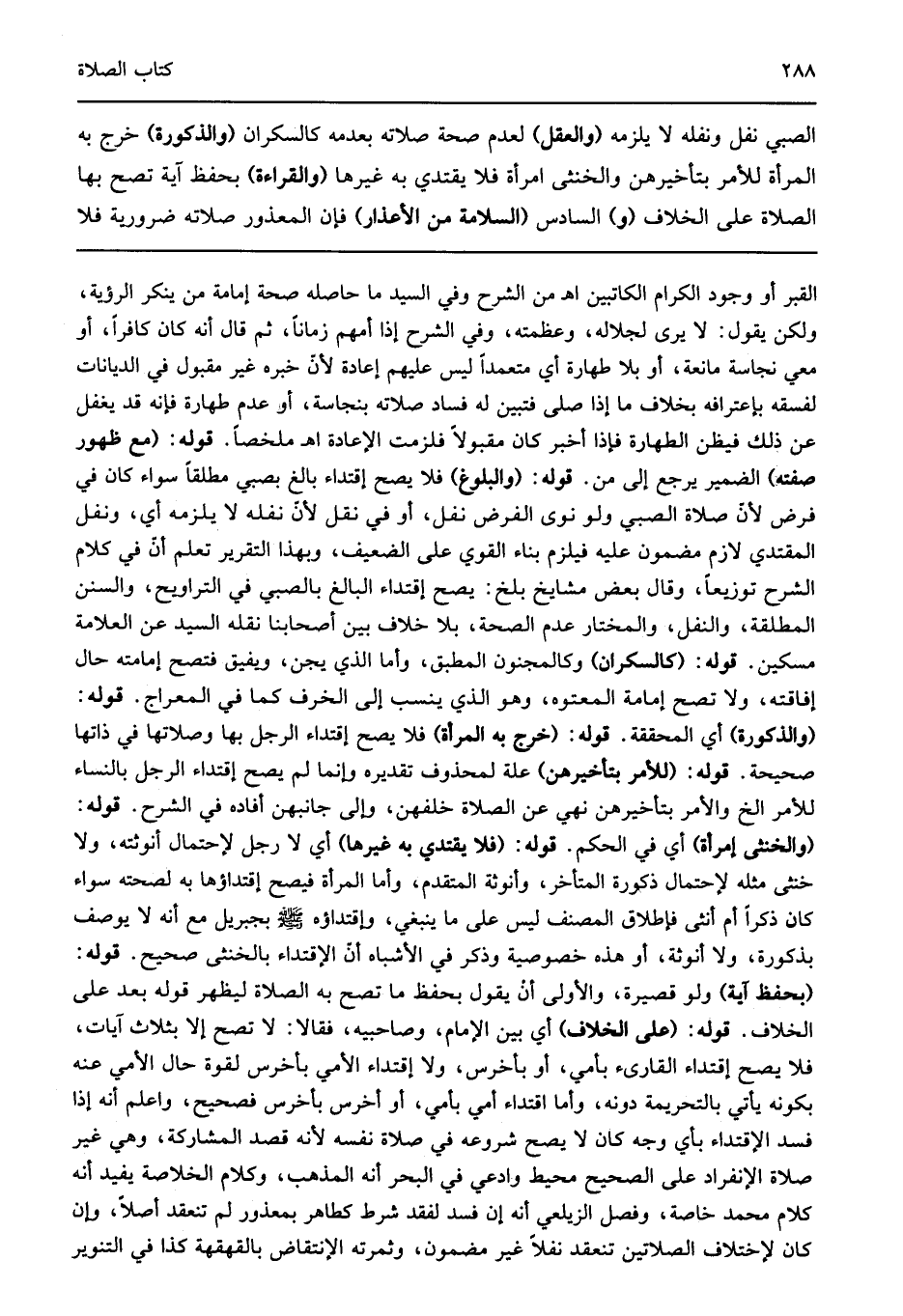 القبر أو وجود الكرام الكاتبين اهـ من الشرح وفي السيد ما حاصله صحة إمامة من ينكر الرؤية ولكن يقول لا يرى لجلاله وعظمته وفي الشرح إذا أمهم زمانا ثم قال أنه كان كافرا أو معي نجاسة مانعة أو بلا طهارة أي متعمدا ليس عليهم إعادة لأن خبره غير مقبول في الديانات لفسقه بإعترافه بخلاف ما إذا صلى فتبين له فساد صلاته بنجاسة أو عدم طهارة فإنه قد يغفل عن ذلك فيظن الطهارة فإذا أخبر كان مقبولا فلزمت الإعادة اهـ ملخصا قوله: "مع ظهور صفته" الضمير يرجع إلى من قوله: "والبلوغ" فلا يصح إقتداء بالغ بصبي مطلقا سواء كان في فرض لأن صلاة الصبي ولو نوى الفرض نفل أو في نقل لأن نفله لا يلزمه أي ونفل المقتدي لازم مضمون عليه فيلزم بناء القوي على الضعيف وبهذا التقرير تعلم أن في كلام الشرح توزيعا وقال بعض مشايخ بلخ يصح إقتداء البالغ بالصبي في التراويح والسنن المطلقة والنفل والمختار عدم الصحة بلا خلاف بين أصحابنا نقله السيد عن العلامة مسكين قوله: "كالسكران" وكالمجنون المطبق وأما الذي يجن ويفيق فتصح إمامته حال إفاقته ولا تصح إمامة المعتوه وهو الذي ينسب إلى الخرف كما في المعراج قوله: "والذكورة" أي المحققة قوله: "خرج به المرأة" فلا يصح إقتداء الرجل بها وصلاتها في ذاتها صحيحة قوله: "للأمر بتأخيرهن" علة لمحذوف تقديره وإنما لم يصح إقتداء الرجل بالنساء للأمر الخ والأمر بتأخيرهن نهي عن الصلاة خلفهن وإلى جانبهن أفاده في الشرح قوله: "والخنثى إمرأة" أي في الحكم قوله: "فلا يقتدي به غيرها" أي لا رجل لإحتمال أنوثته ولا خنثى مثله لإحتمال ذكورة المتأخر وأنوثة المتقدم وأما المرأة فيصح إقتداؤها به لصحته سواء كان ذكرا أم أنثى فإطلاق المصنف ليس على ما ينبغي وإقتداؤه صلى الله عليه وسلم بجبريل مع أنه لا يوصف بذكورة ولا أنوثة أو هذه خصوصية وذكر في الأشباه أن الإقتداء بالخنثى صحيح قوله: "بحفظ آية" ولو قصيرة والأولى أن يقول بحفظ ما تصح به الصلاة ليظهر قوله بعد على الخلاف قوله: "على الخلاف" أي بين الإمام وصاحبيه فقالا لا تصح إلا بثلاث آيات فلا يصح إقتداء القارىء بأمي أو بأخرس ولا إقتداء الأمي بأخرس لقوة حال الأمي عنه بكونه يأتي بالتحريمة دونه وأما اقتداء أمي بأمي أو أخرس بأخرس فصحيح واعلم أنه إذا فسد الإقتداء بأي وجه كان لا يصح شروعه في صلاة نفسه لأنه قصد المشاركة وهي غير صلاة الإنفراد على الصحيح محيط وادعي في البحر أنه المذهب وكلام الخلاصة يفيد أنه كلام محمد خاصة وفصل الزيلعي أنه إن فسد لفقد شرط كطاهر بمعذور لم تنعقد أصلا وإن كان لإختلاف الصلاتين تنعقد نفلا غير مضمون وثمرته الإنتقاض بالقهقهة كذا في التنوير